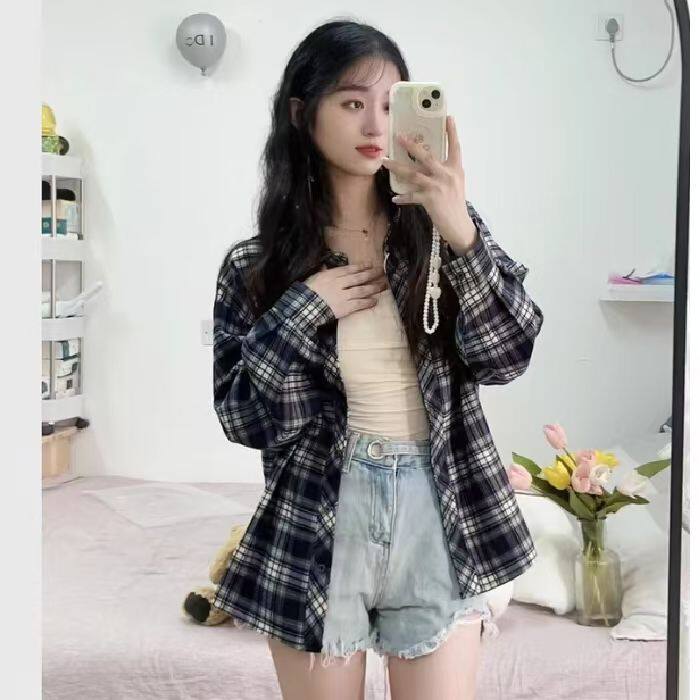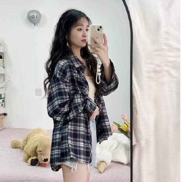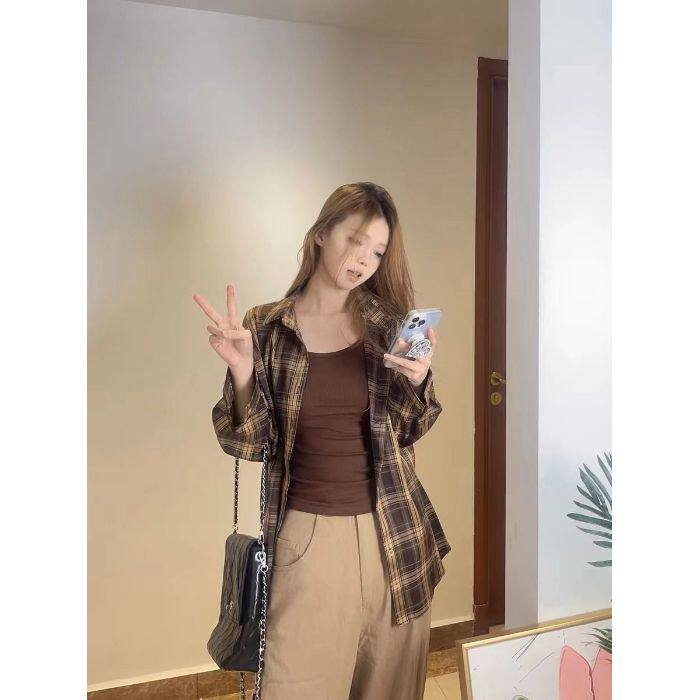 韩式覆古长袖格子衬衫外套女春秋季设计感小众宽松百搭翻领衬衣潮