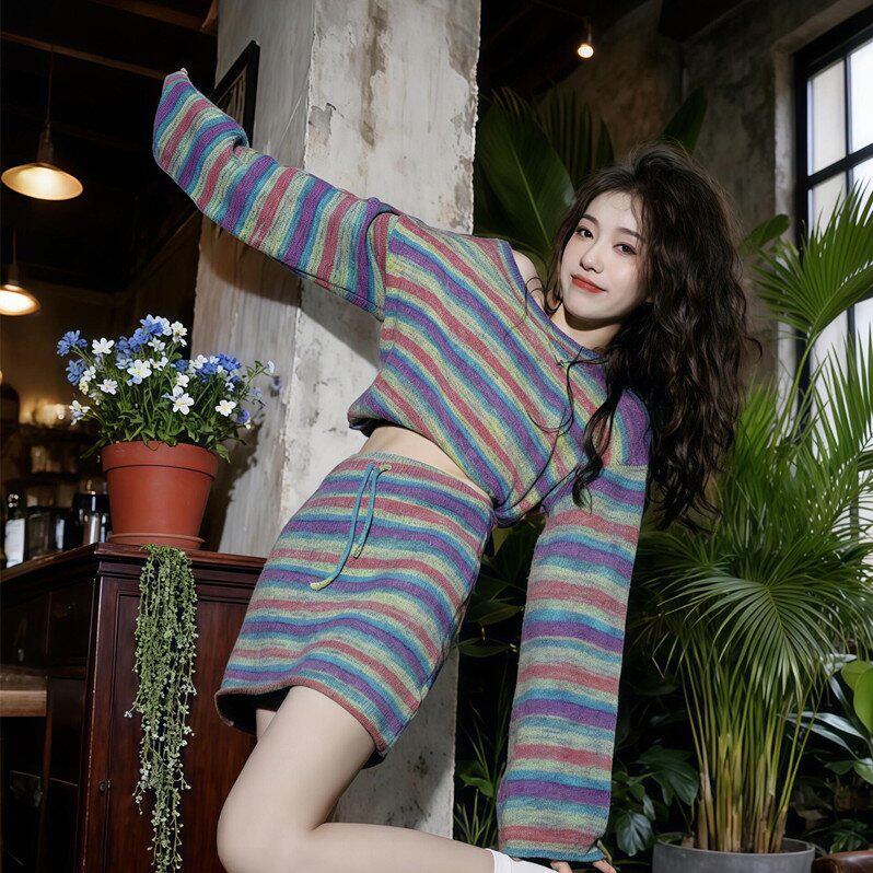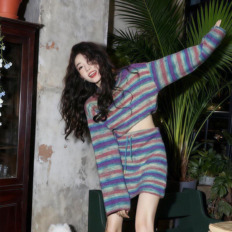 彩虹条纹一整套穿搭女秋冬新款氛围感韩版显瘦洋气百搭短裙两件套
