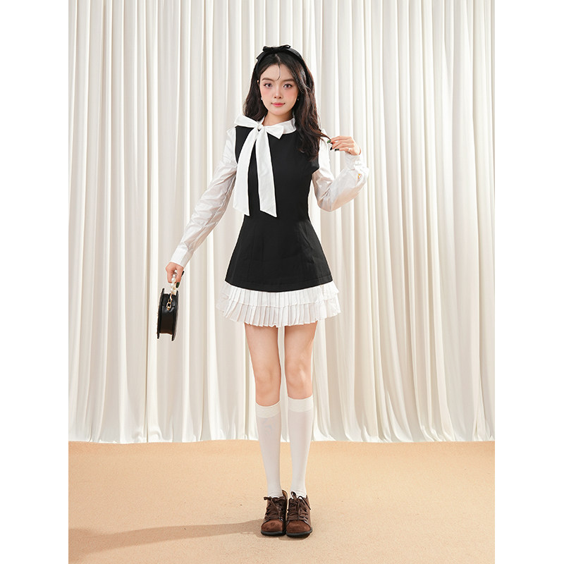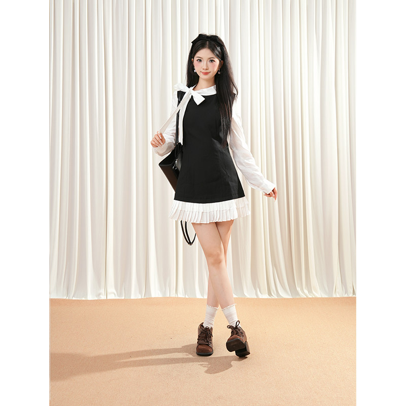 法式系带小香风长袖连衣裙女高级感千金风假两件衬衫收腰百褶短裙