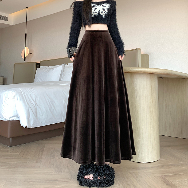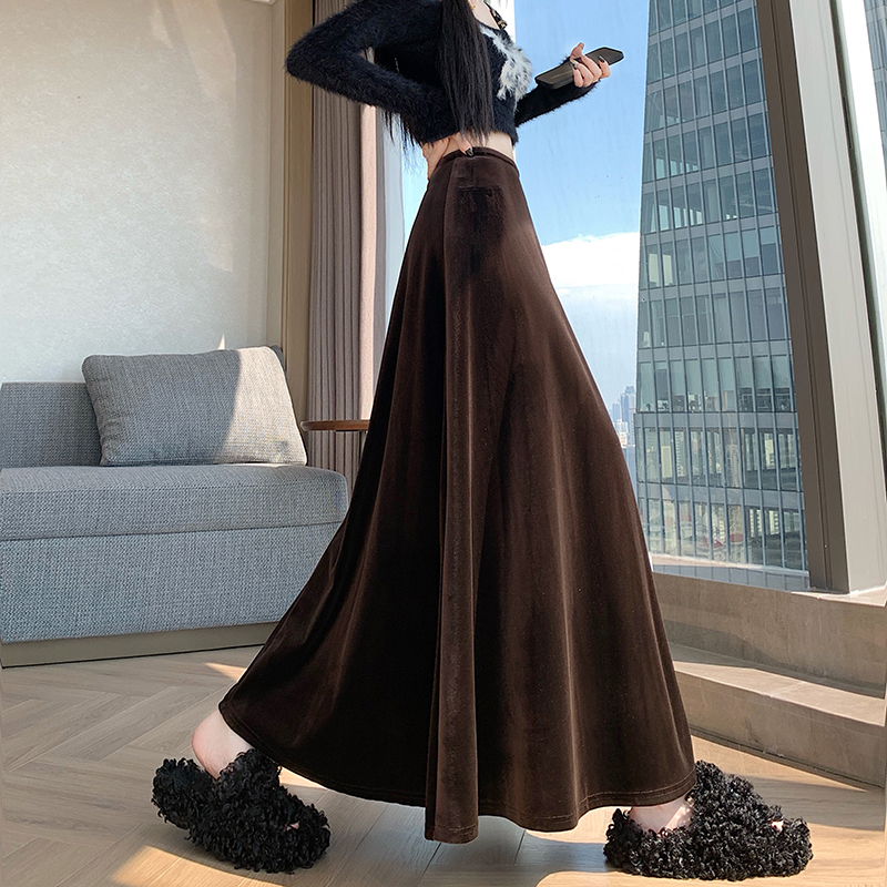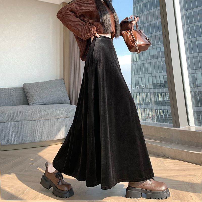 实拍2025高级丝绒软底亲肤面料半身裙超大摆长裙松紧腰秋冬中长裙