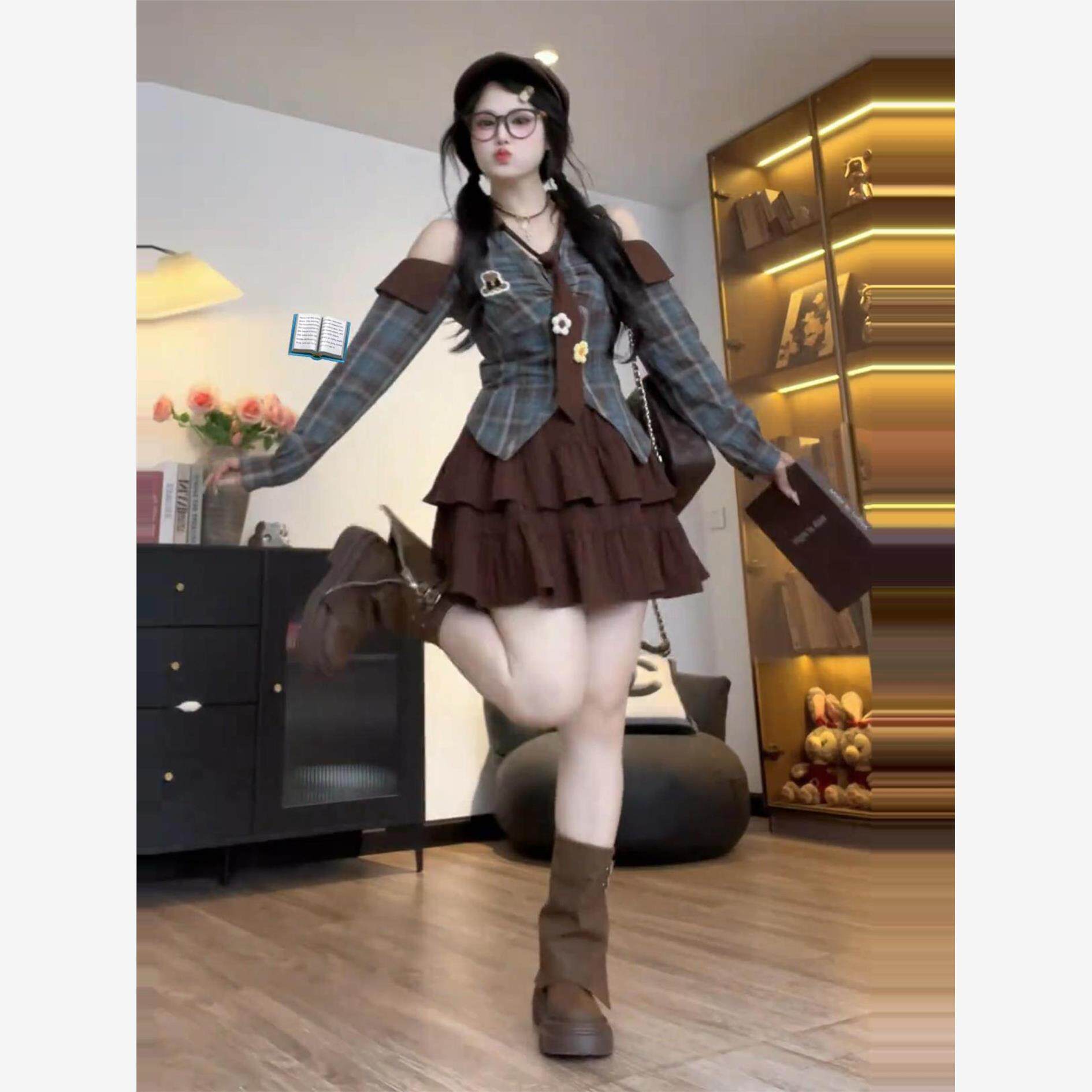 大码法式独特精致露肩格子衬衫女春秋胖mm显瘦a字半身长裙两件套