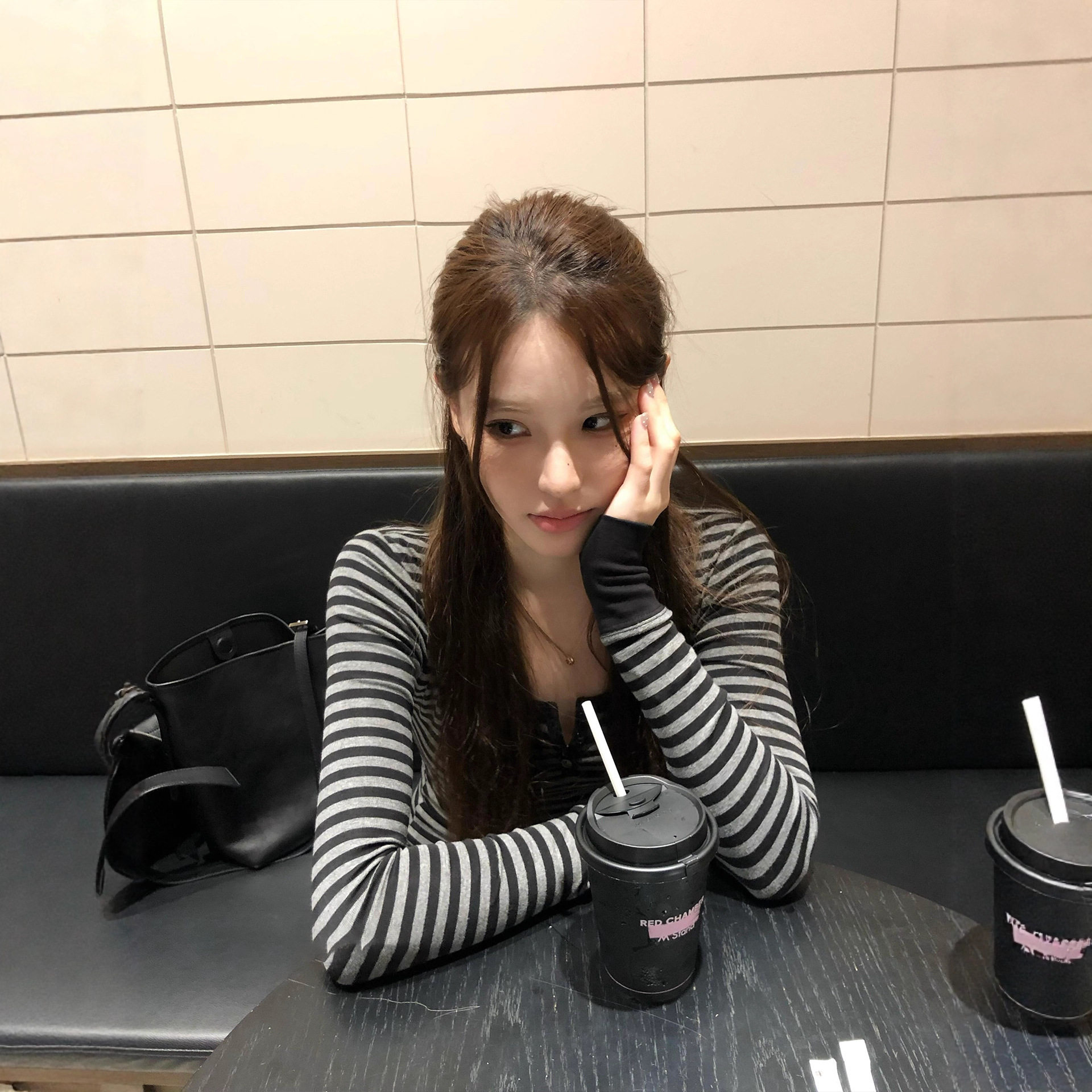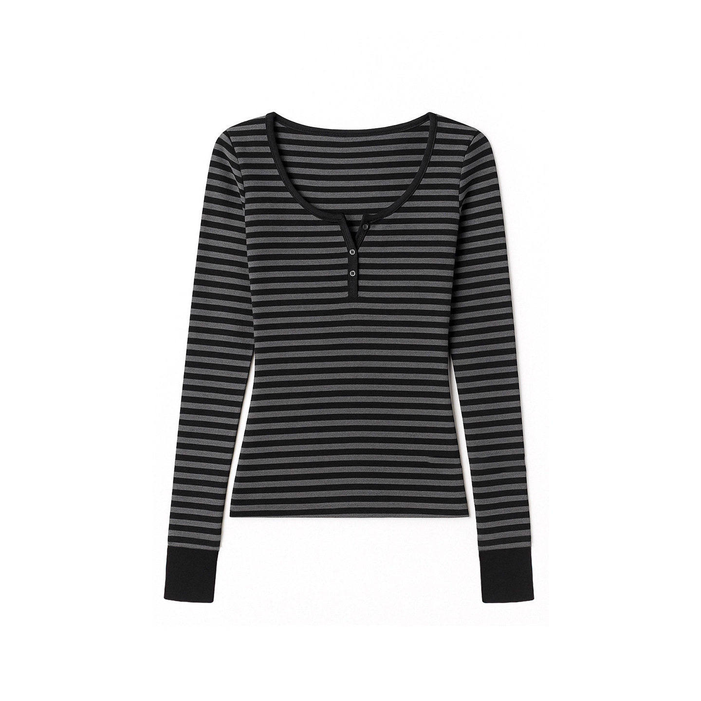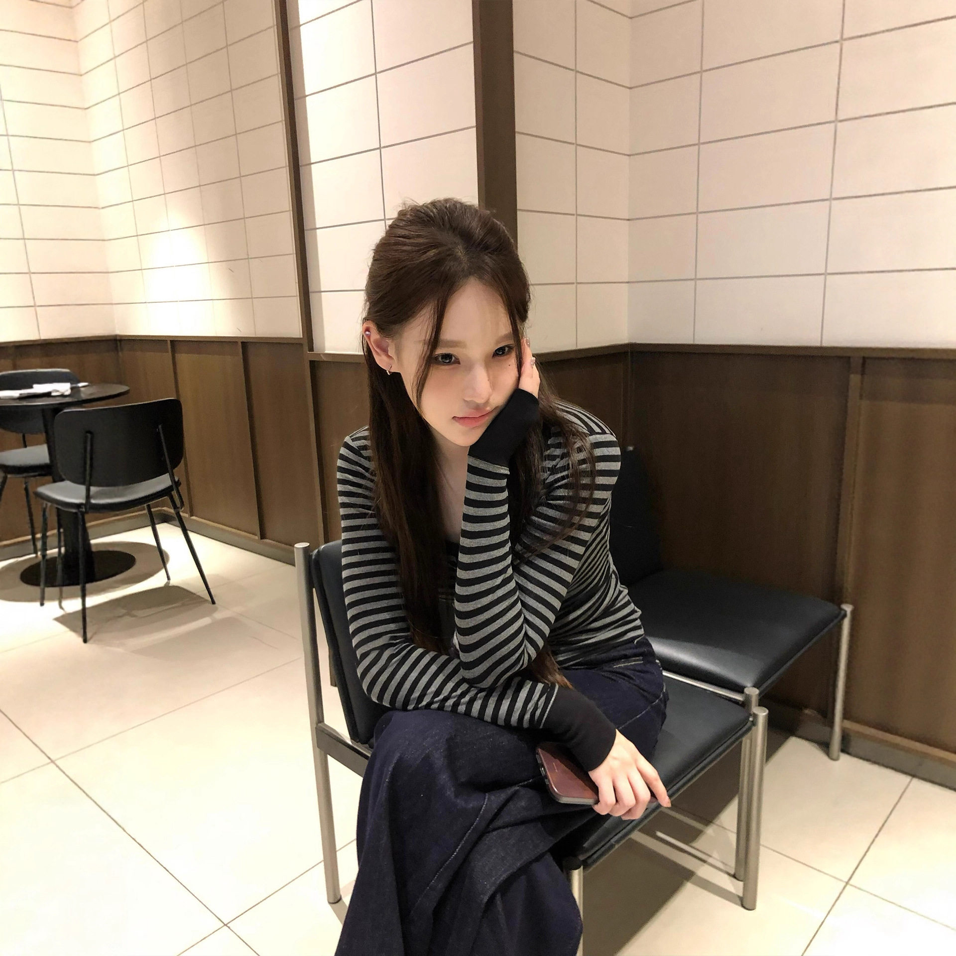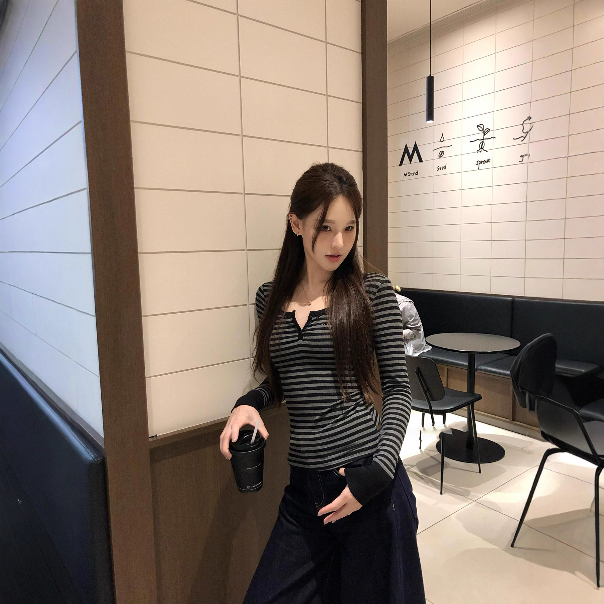 亲肤条纹U型领口T恤正肩显瘦性感辣妹上衣秋冬季新款修身长袖内搭