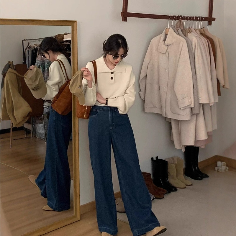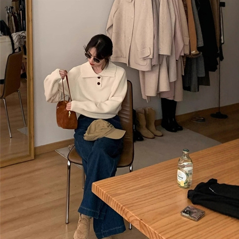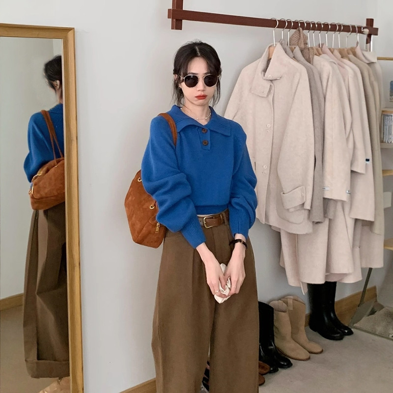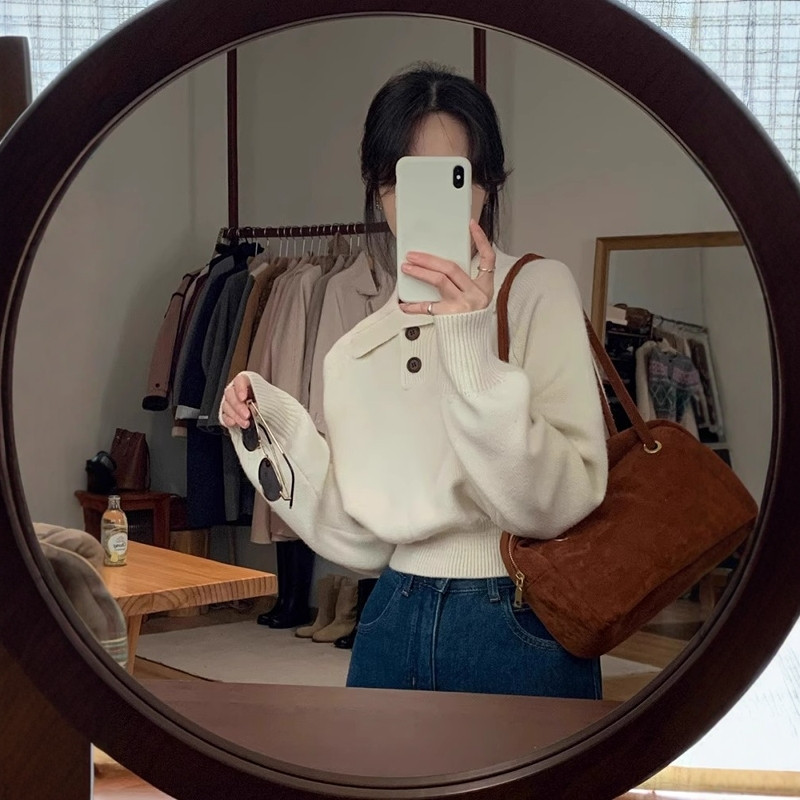 法式翻领毛衣女秋冬慵懒风短款内搭打底针织衫气质polo衫上衣