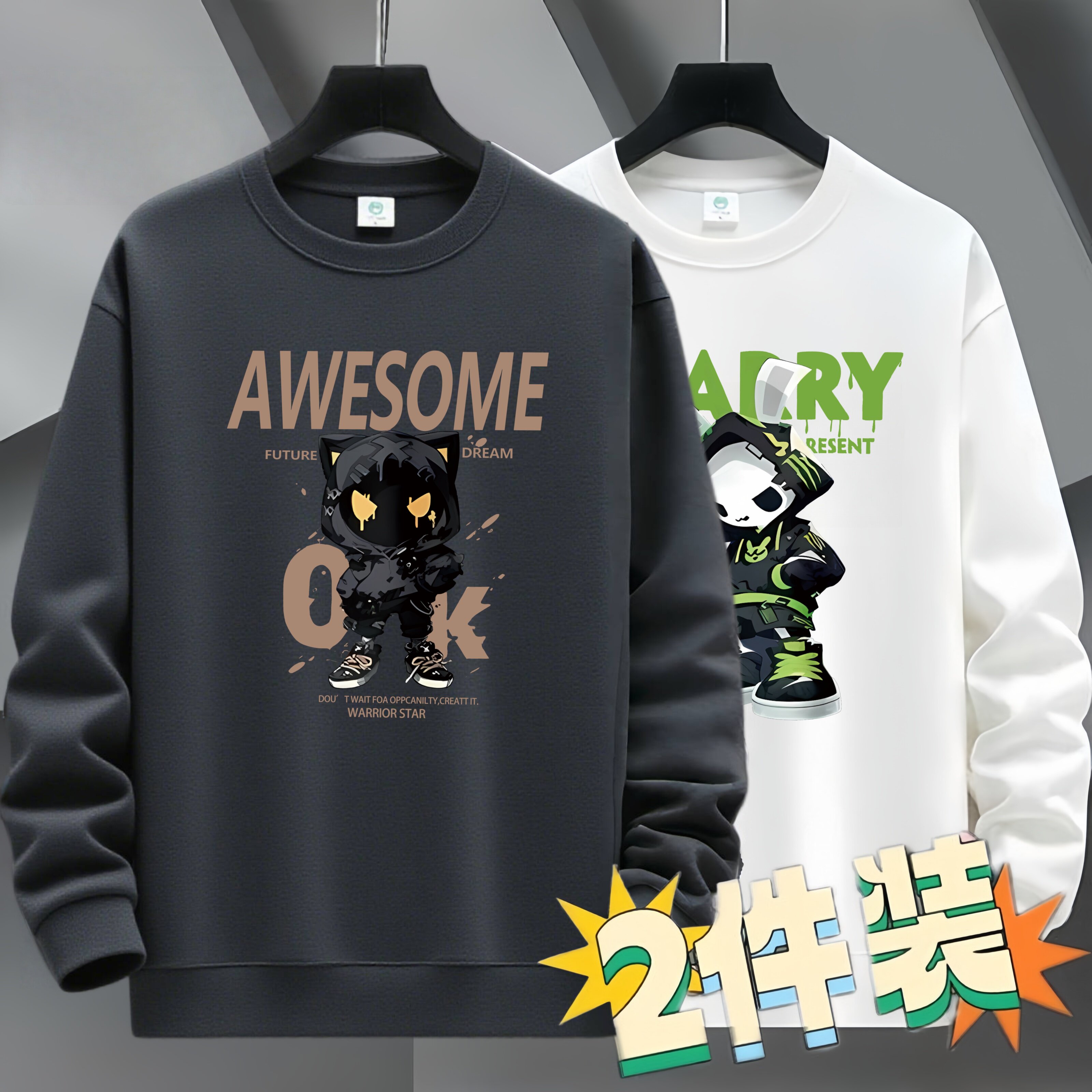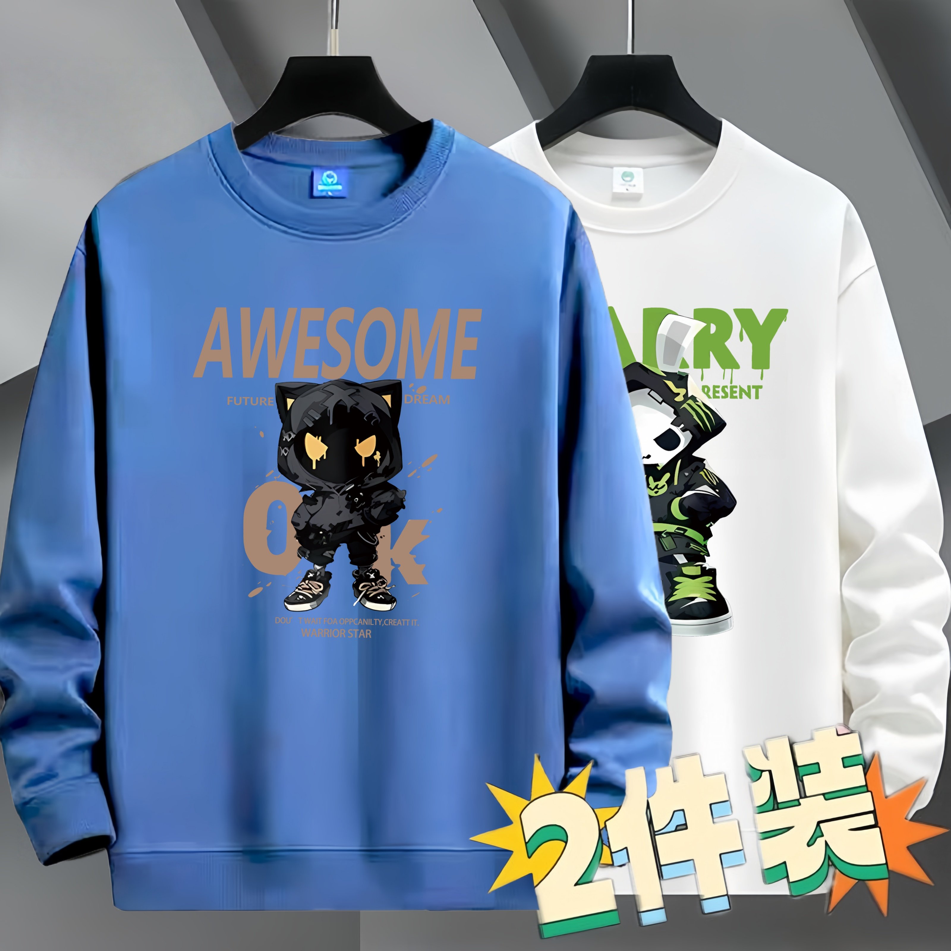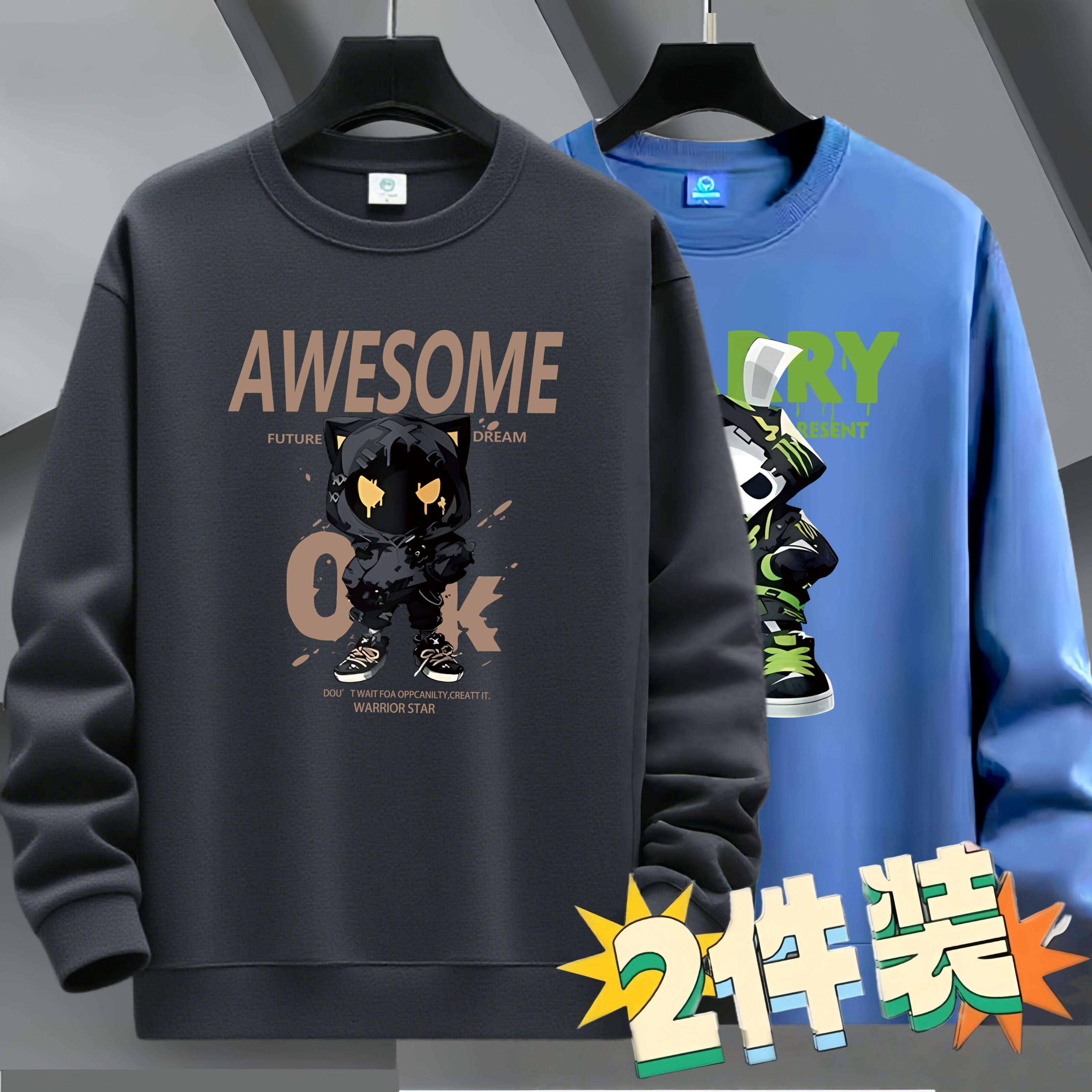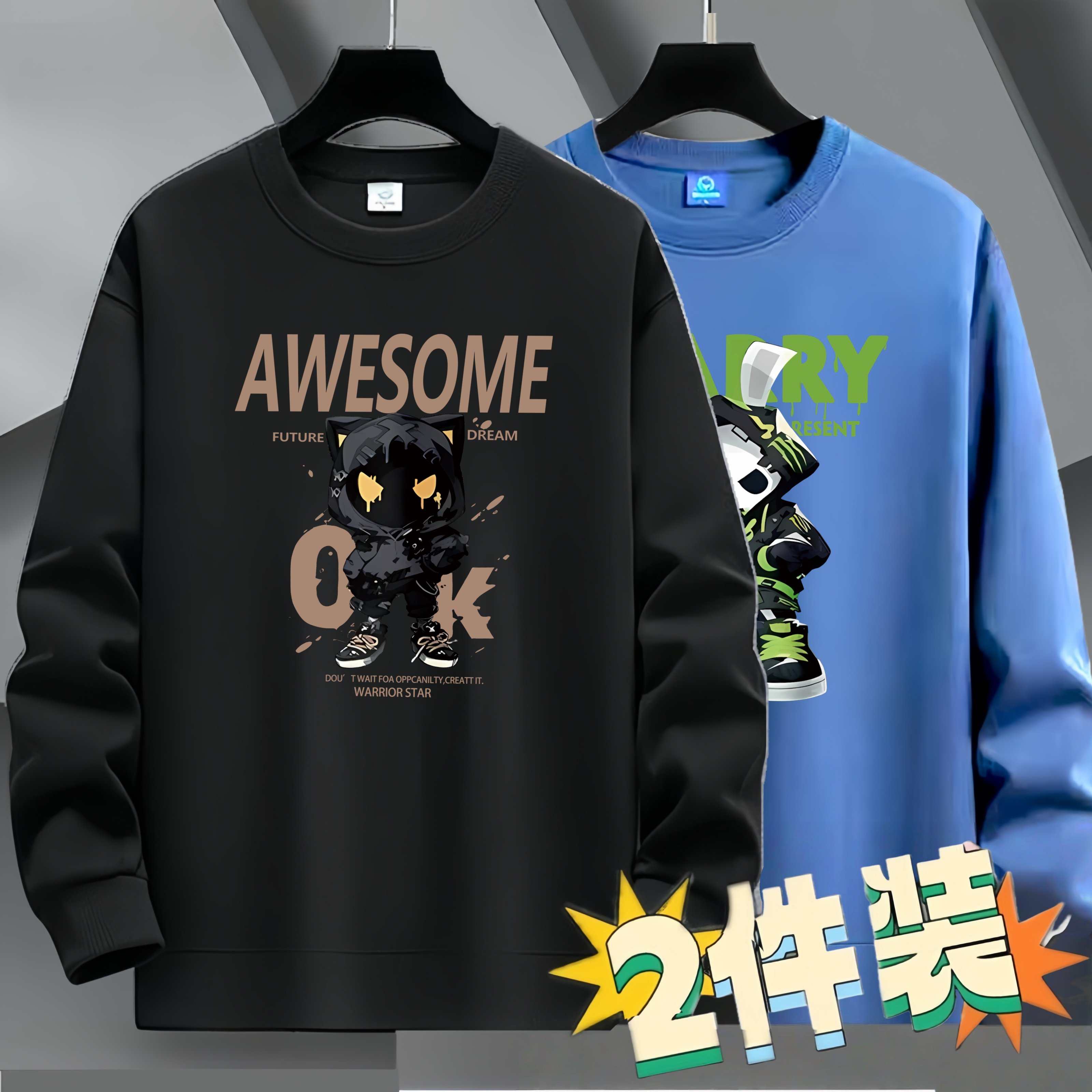 2件装加绒加厚男士卫衣套头圆领长袖T恤薄款宽松上衣青年外套潮