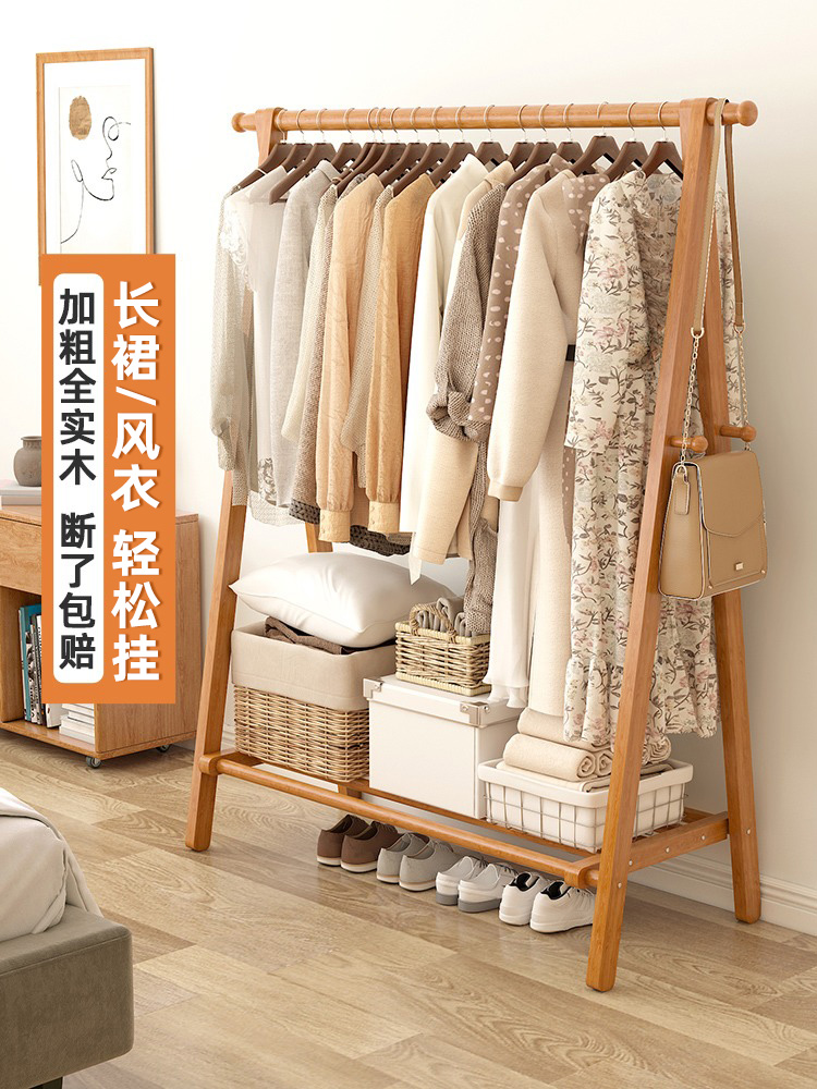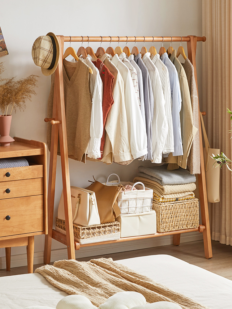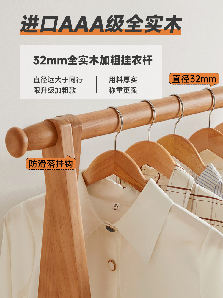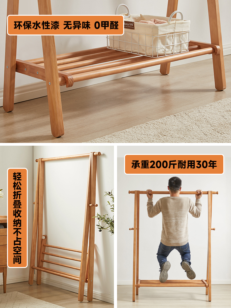 实木衣架落地樱桃木色衣帽架卧室可折叠晾衣架家用挂放衣服架子