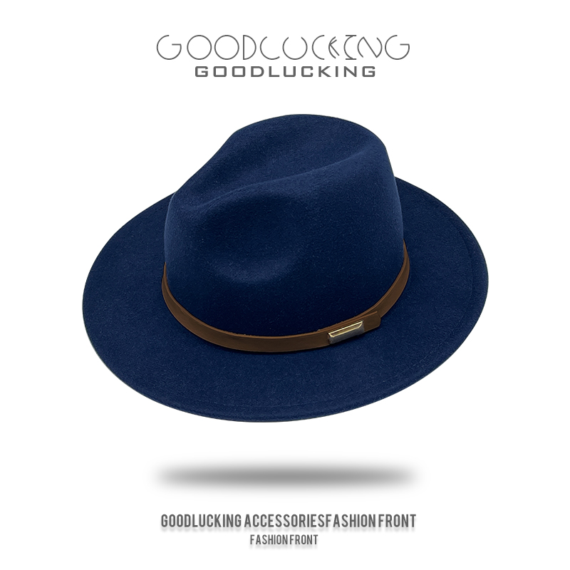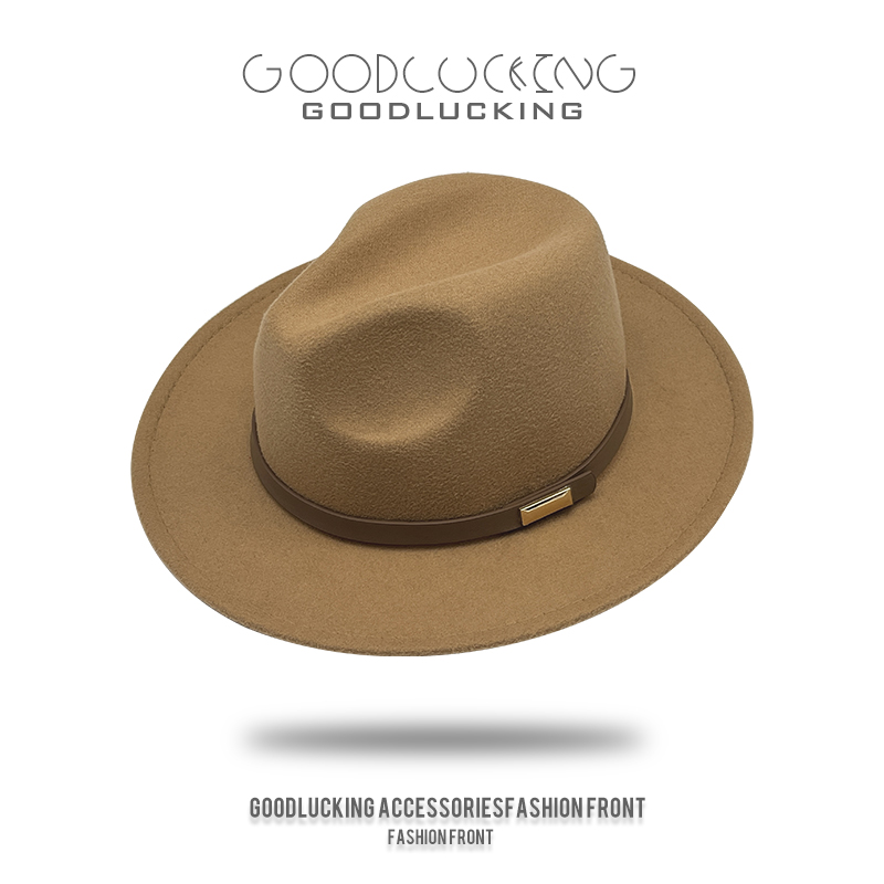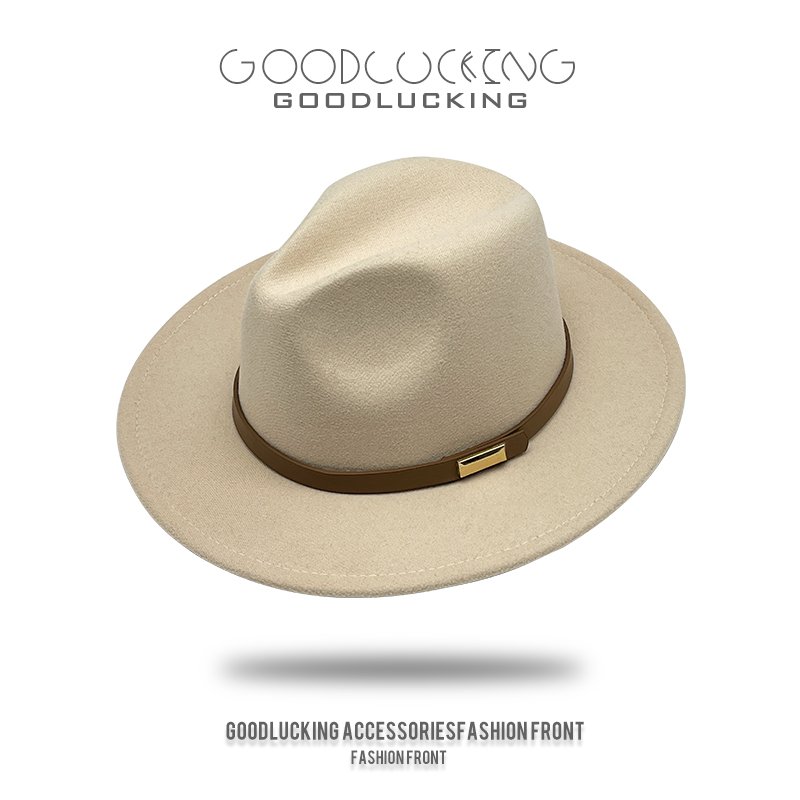 秋冬巴拿马礼帽平檐复古骑士帽男大檐毛呢爵士帽子女法式皮装饰