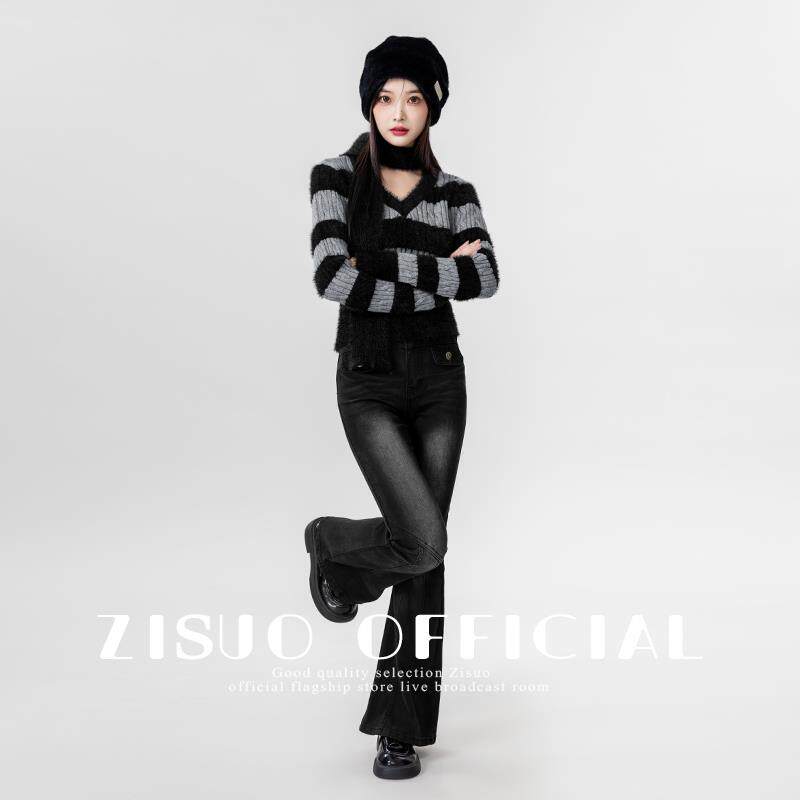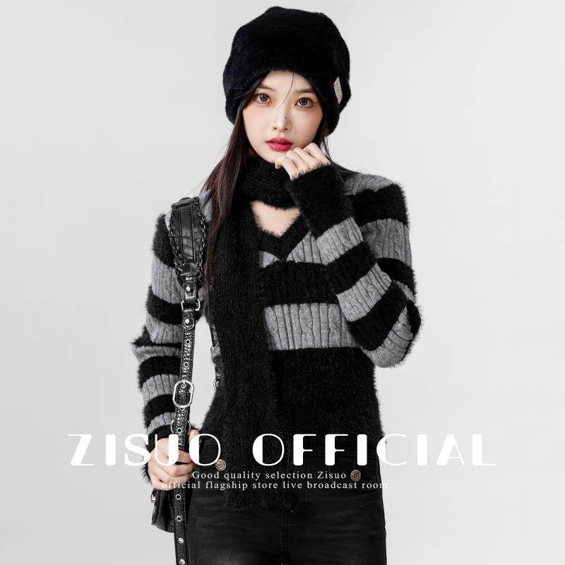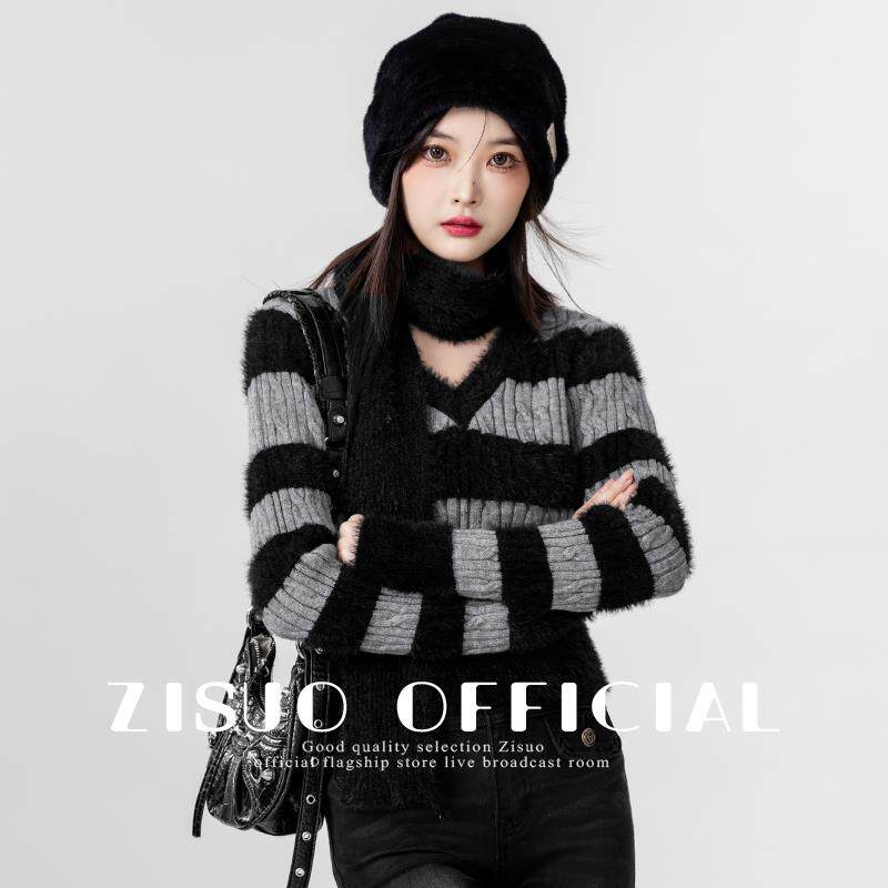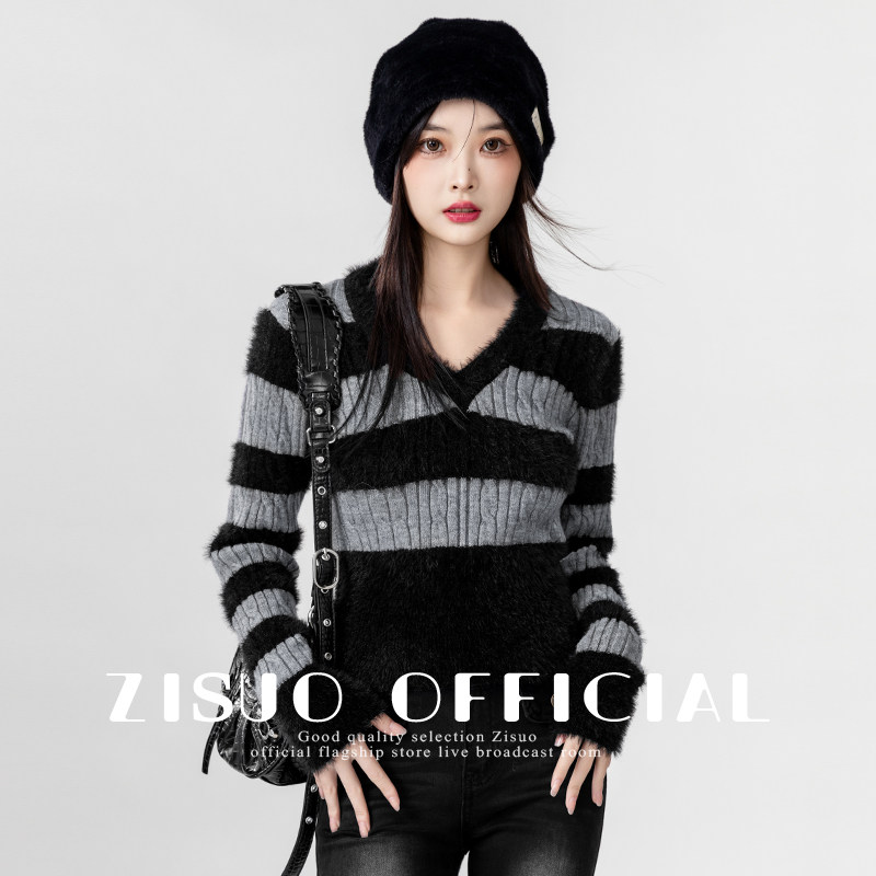 2024春秋新款复古撞色v领毛衣女修身海马毛条纹打底针织衫短上衣