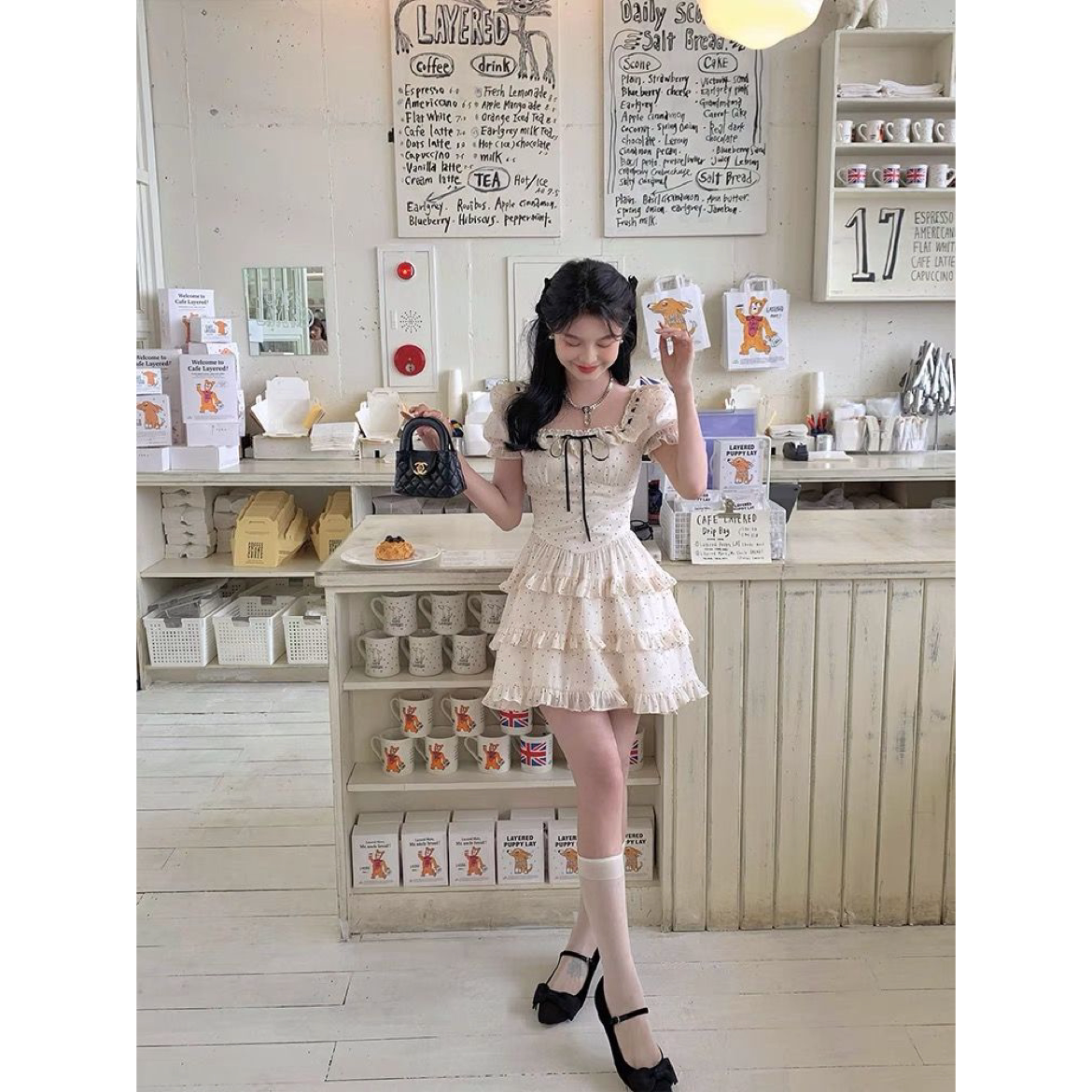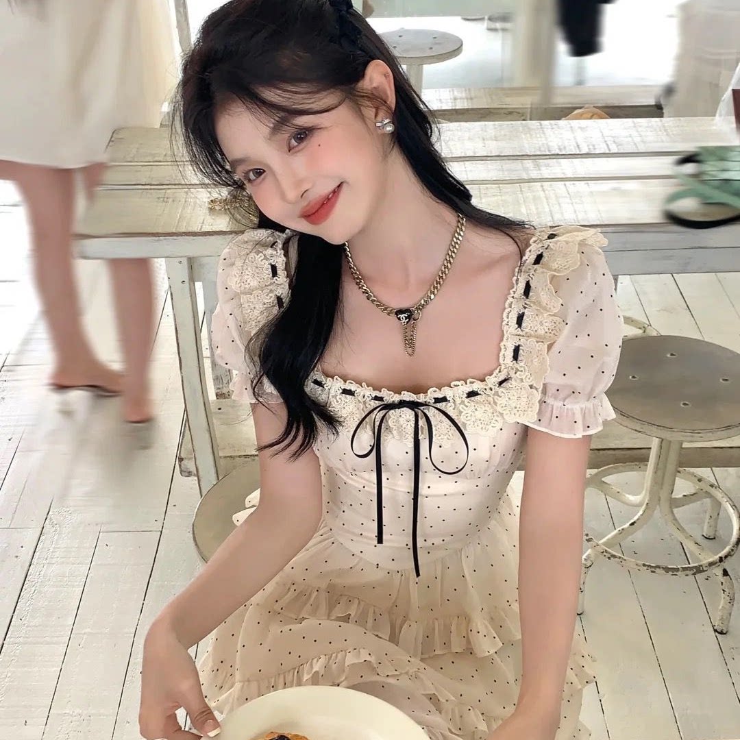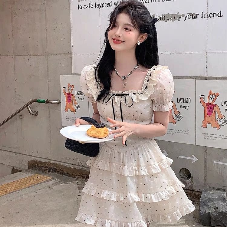 法式甜美温柔风波点蛋糕蓬蓬裙女2025夏季新款收腰显瘦U领连衣裙