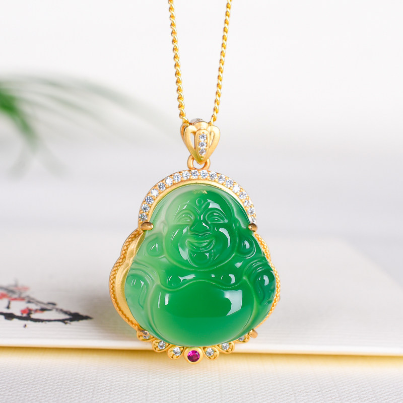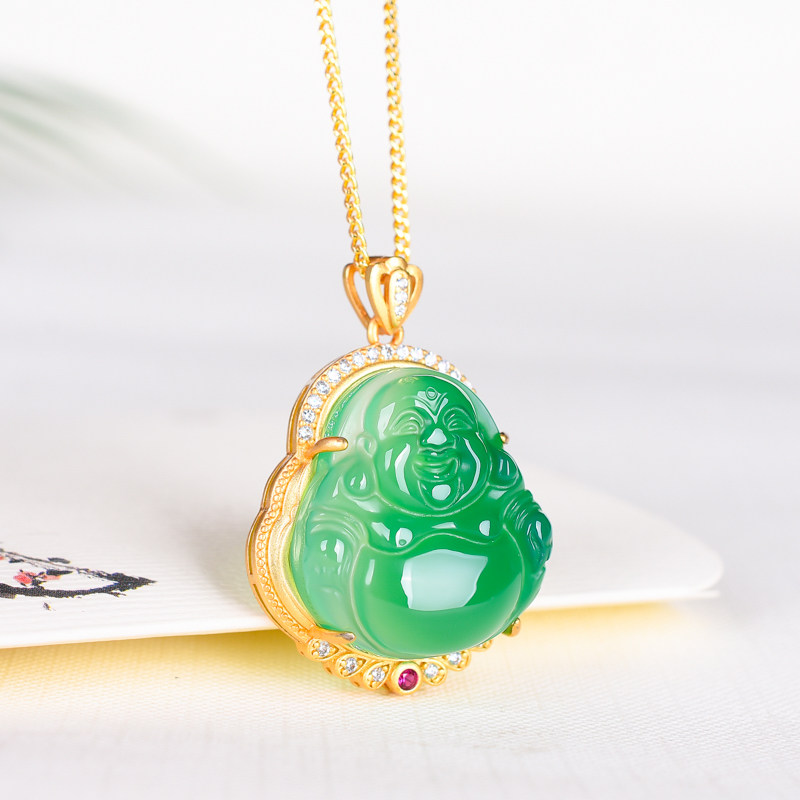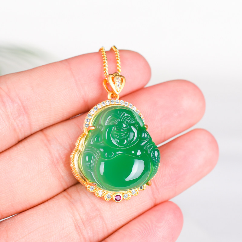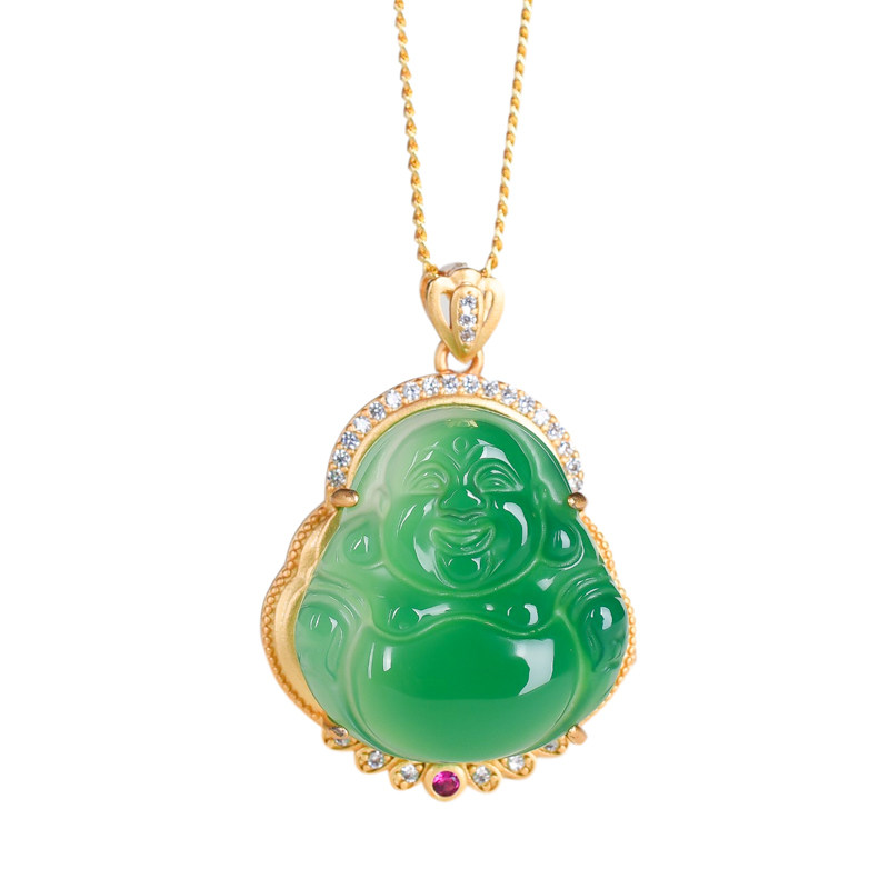 天然绿玉髓弥勒佛吊坠925银古法镶嵌玉项链玉坠节日礼物送链子