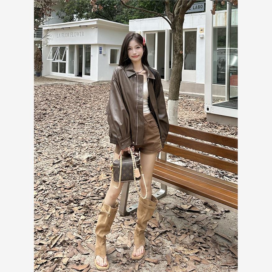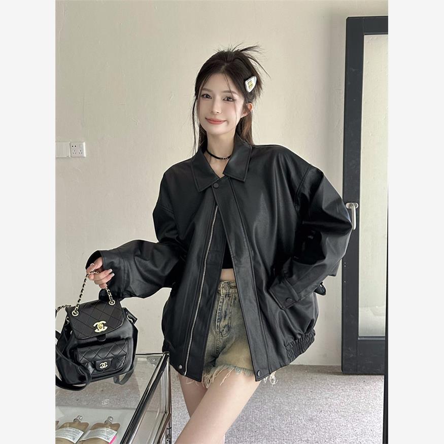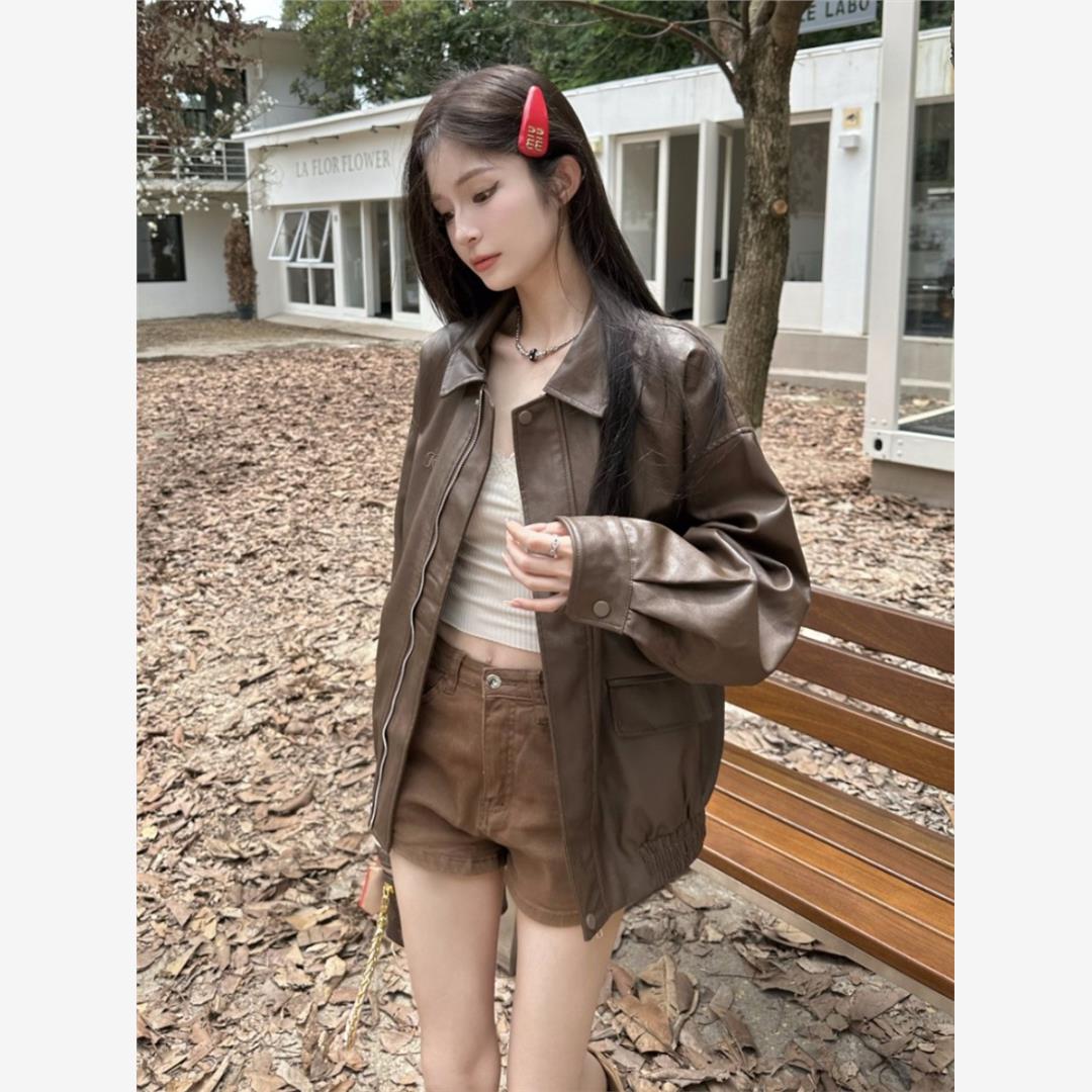 复古美式咖色皮衣夹克外套女秋季黑色甜酷风机车PU皮宽松长袖上衣