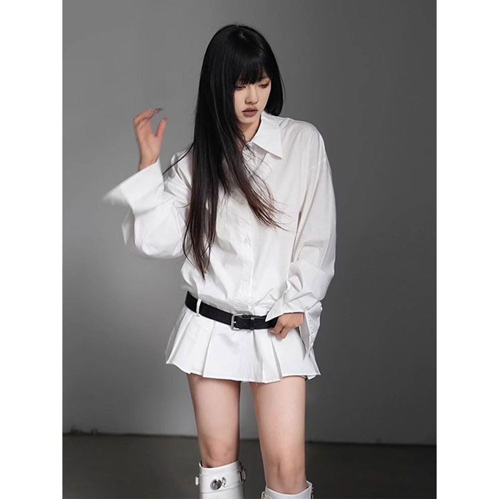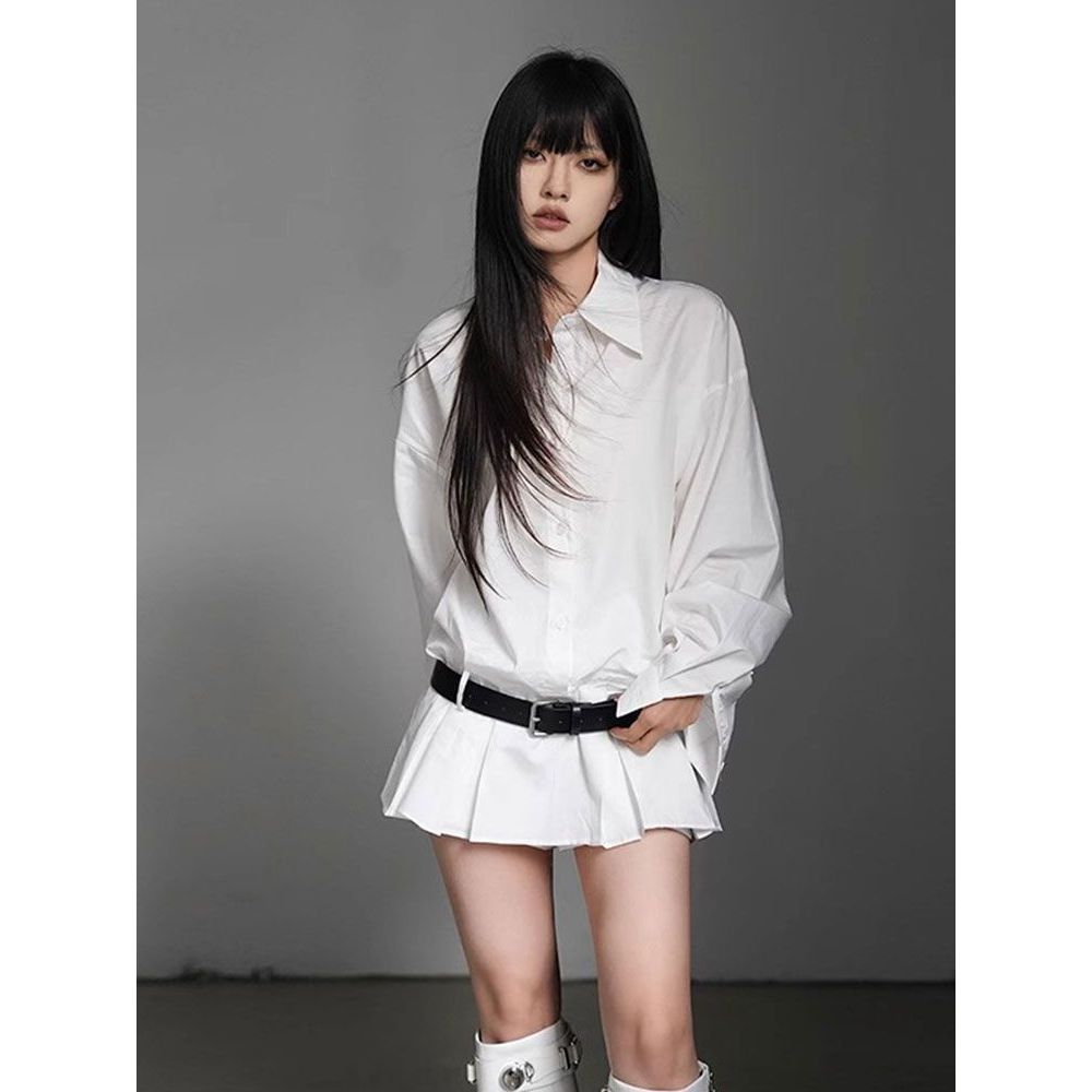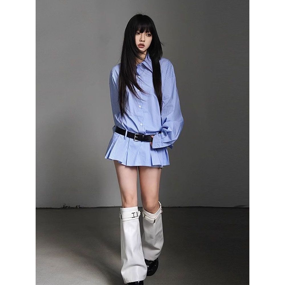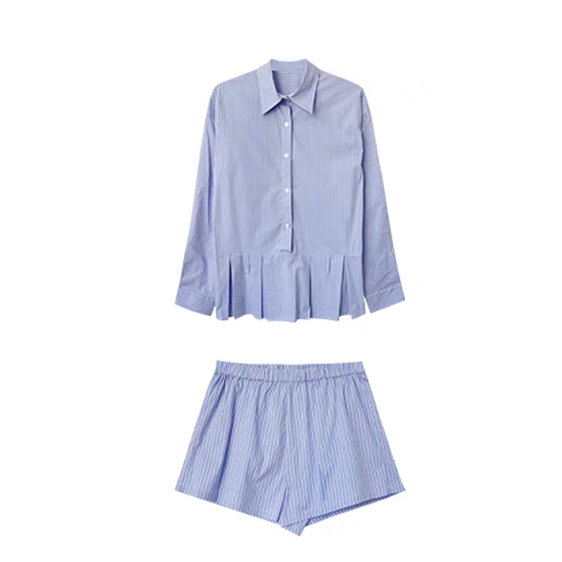 条纹翻领排扣收腰百褶下摆衬衫连衣裙+高腰衬衫短裤两件套配腰带
