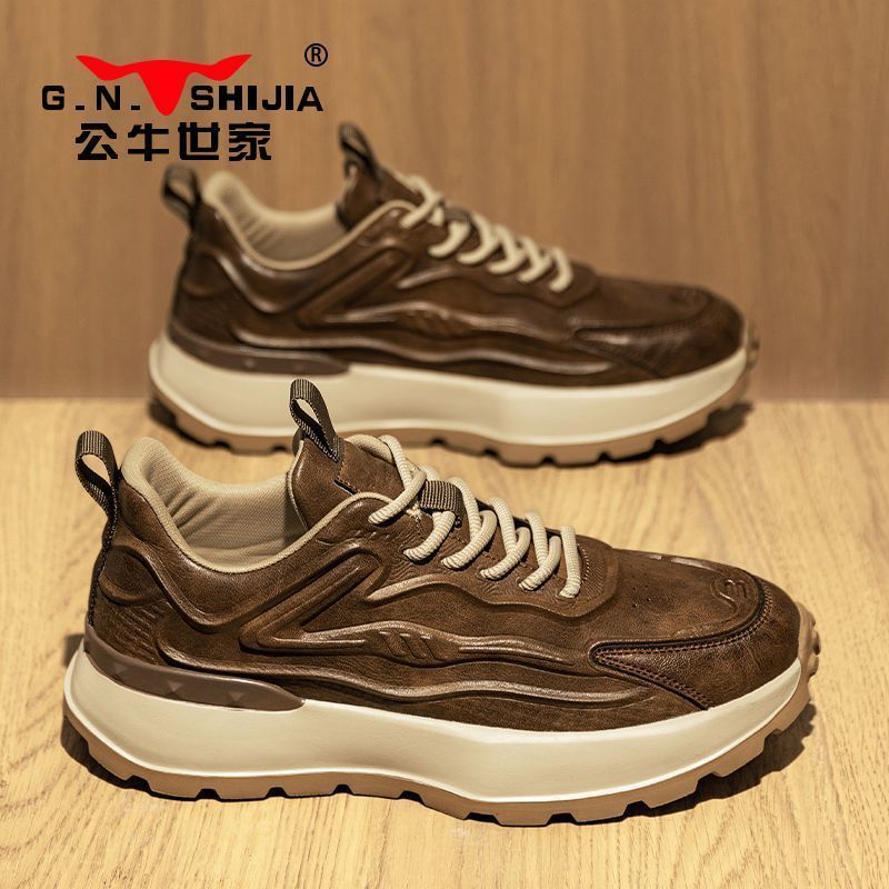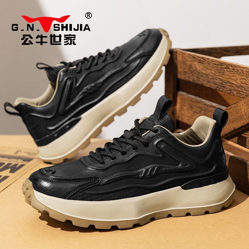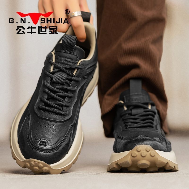 公牛世家男鞋2025秋季防水皮面黑色运动鞋厚底增高爆款跑步老爹鞋
