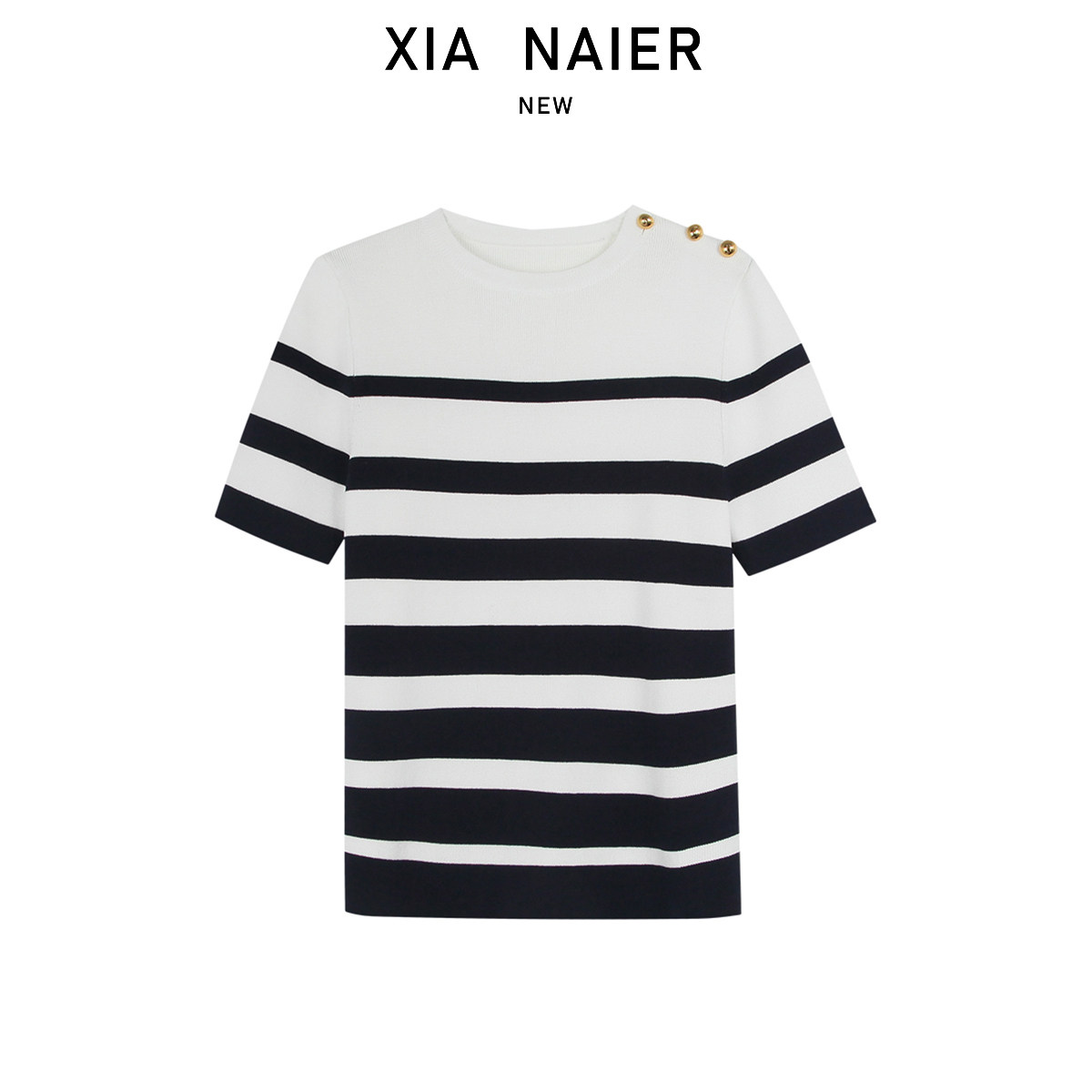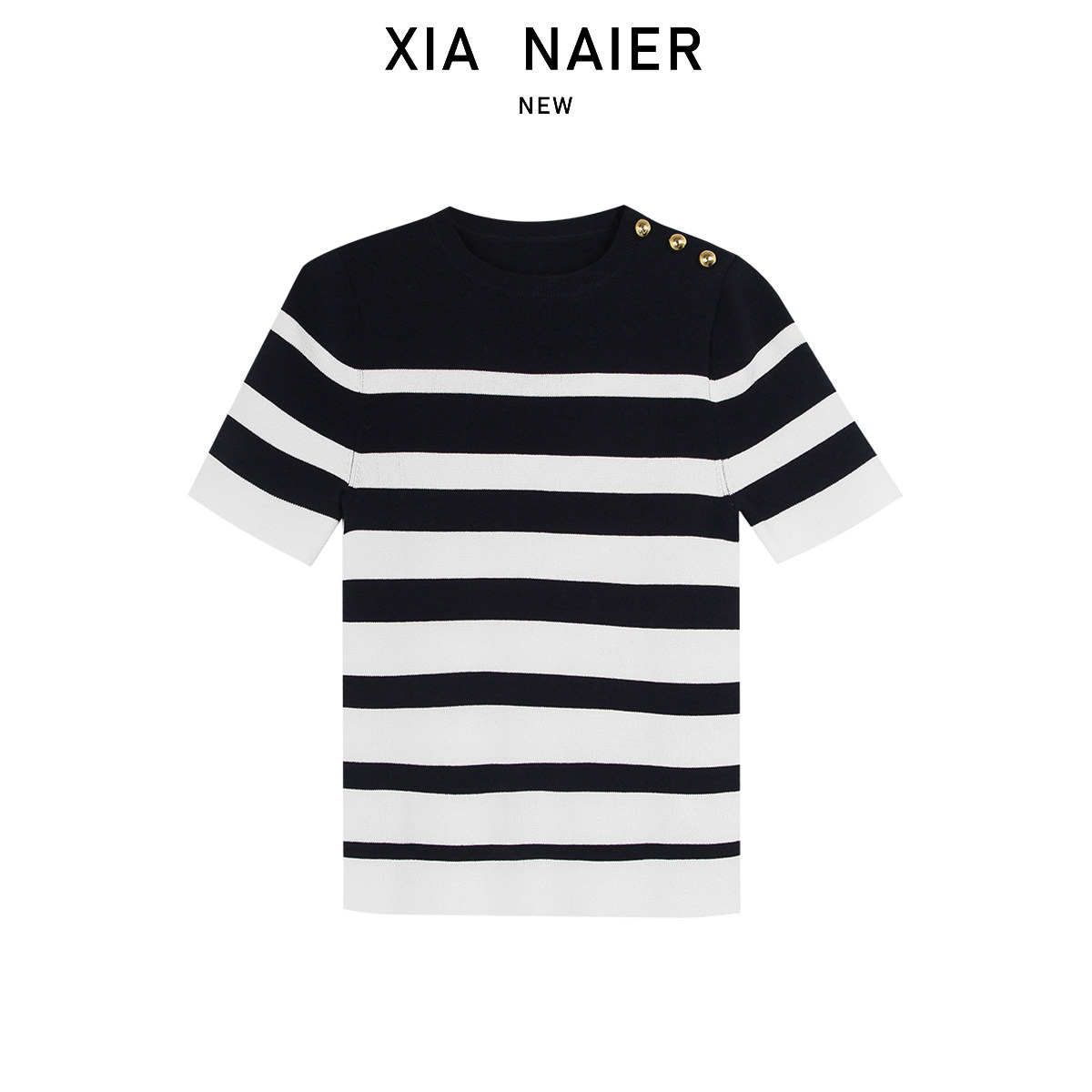 【100伊利特】撞色条纹圆领正肩修身短袖针织上衣5819