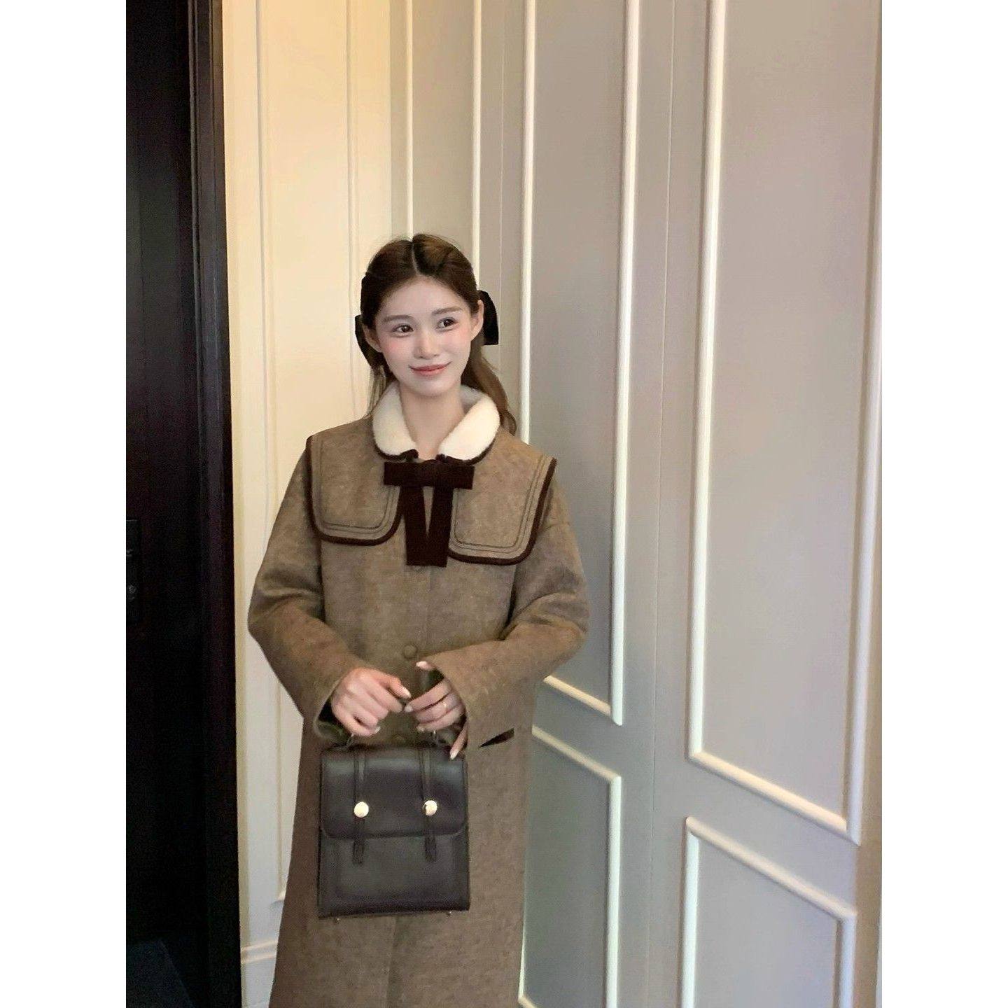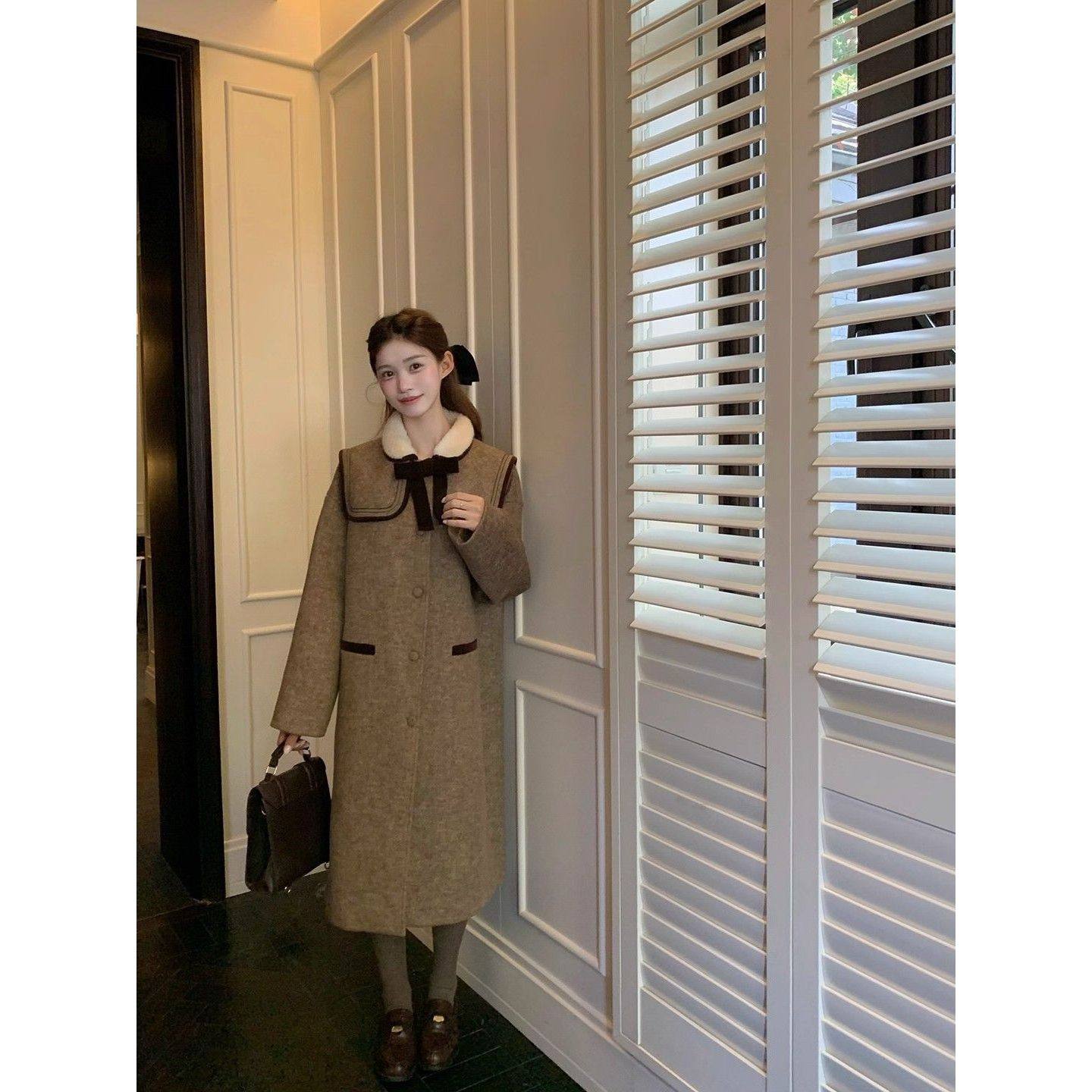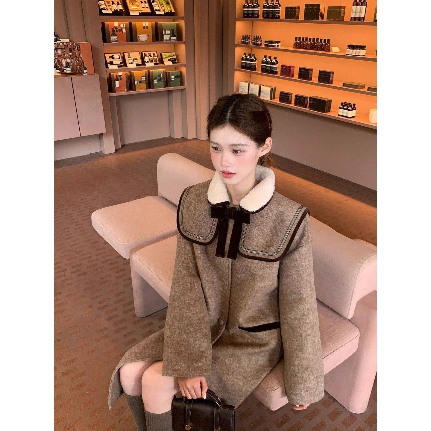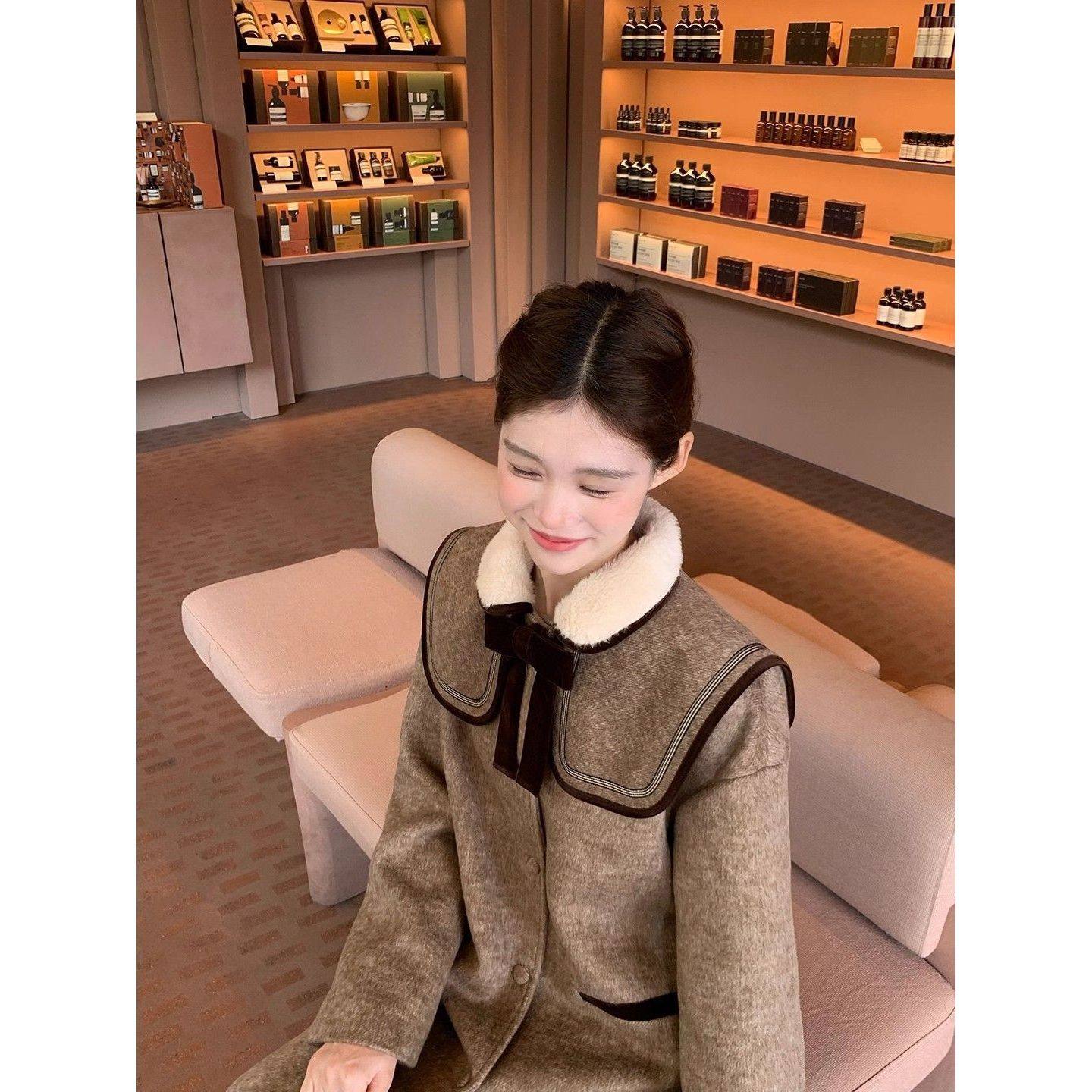 古着磨痕 法式复古毛绒翻领毛呢大衣女25秋冬新款小个子显瘦外套
