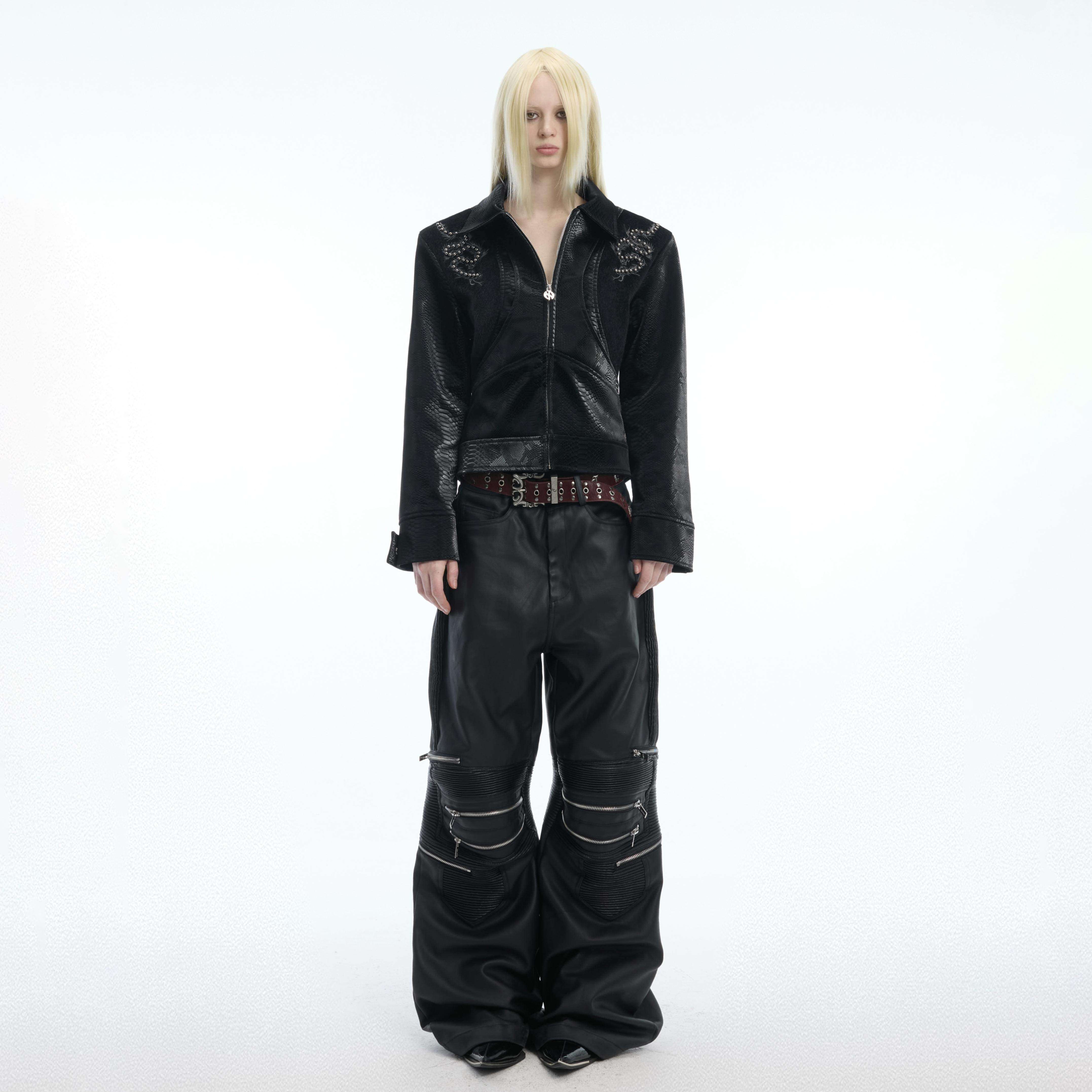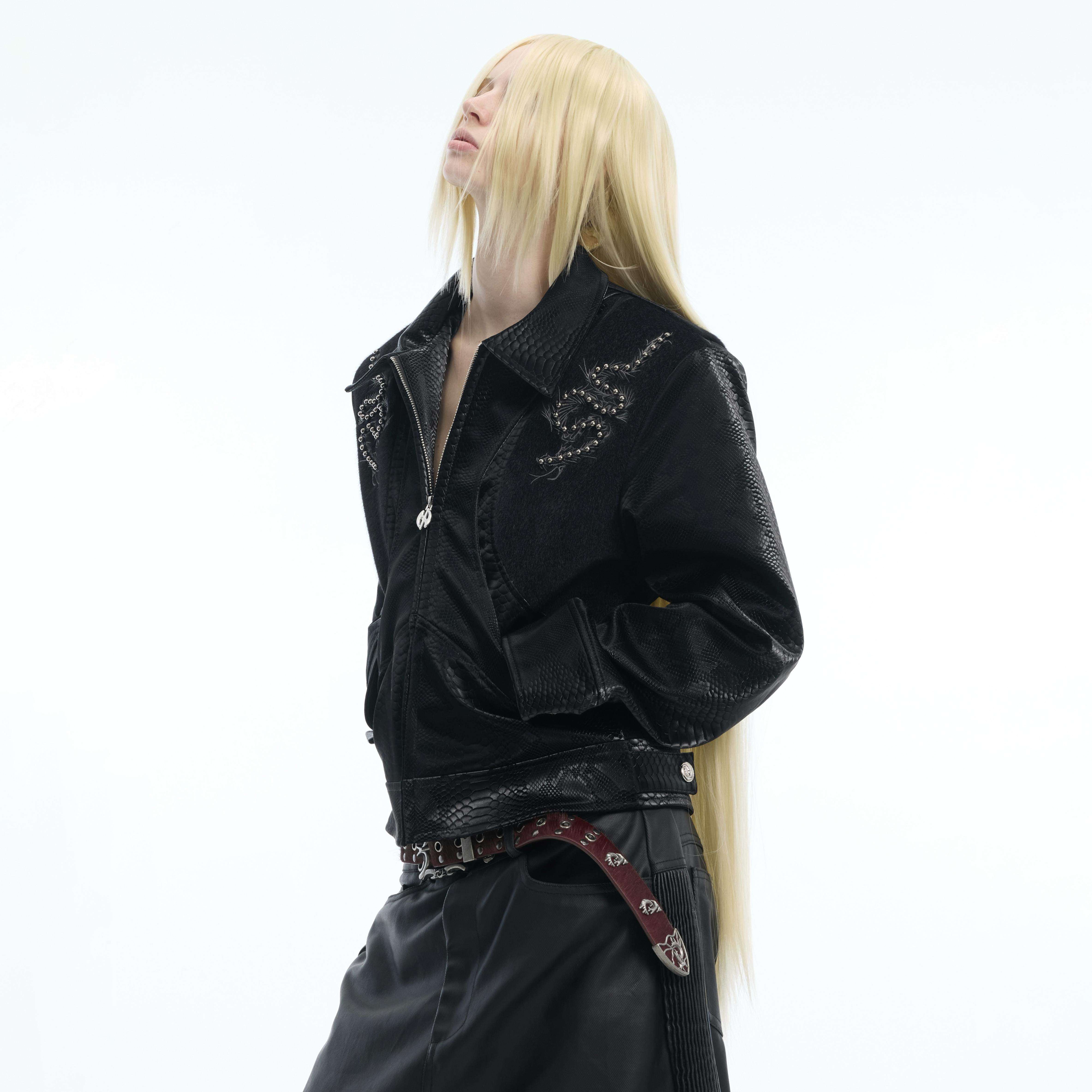 ArguE CulturE蛇脊骨铆钉刺绣皮衣外套女春季PU皮酷飒风黑色上衣