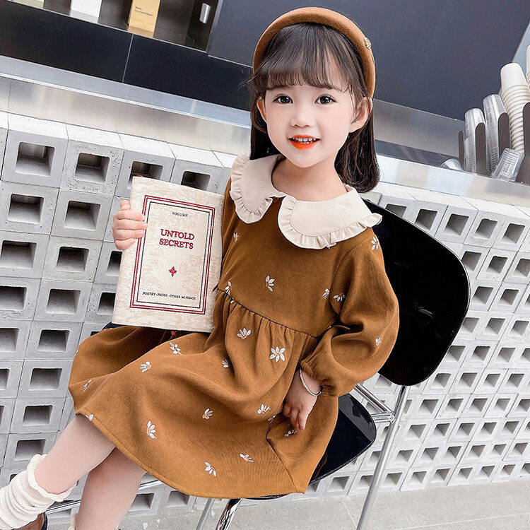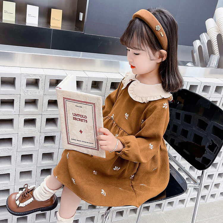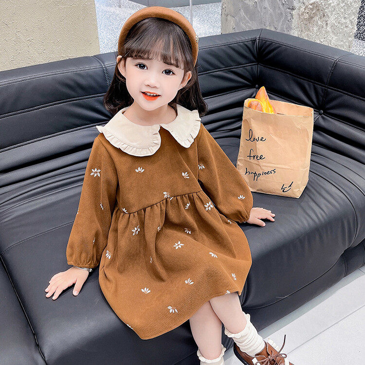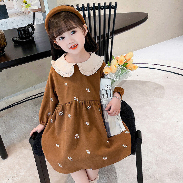 韩版女童连衣裙春秋娃娃领小花装饰收腰A字裙2-8岁咖色