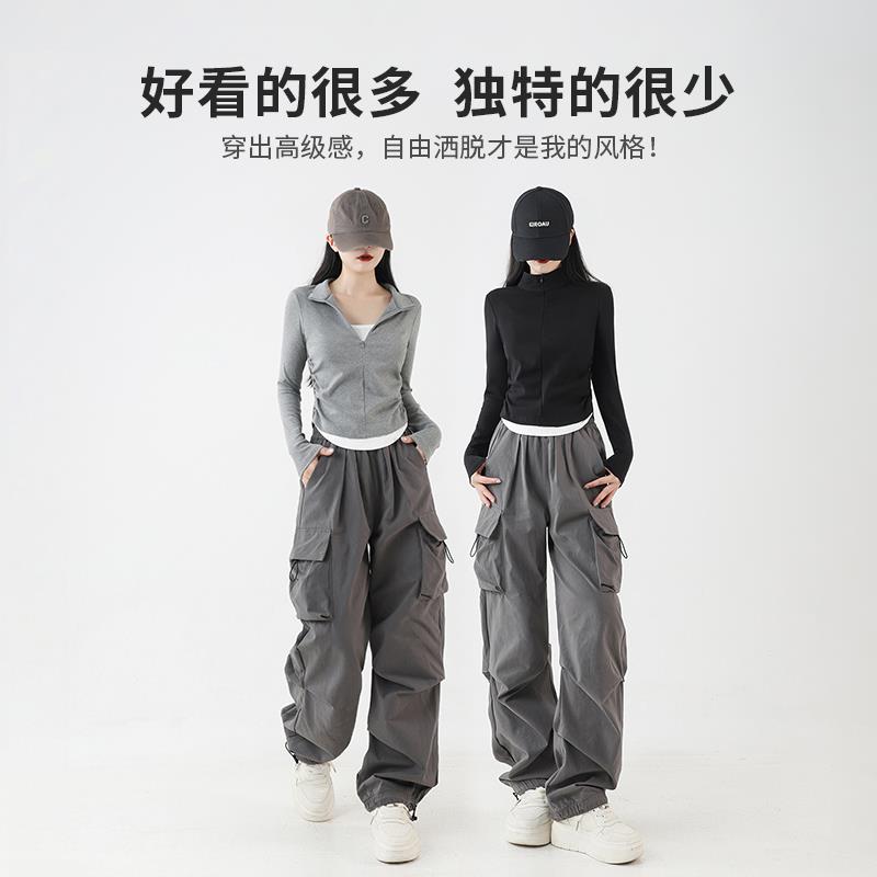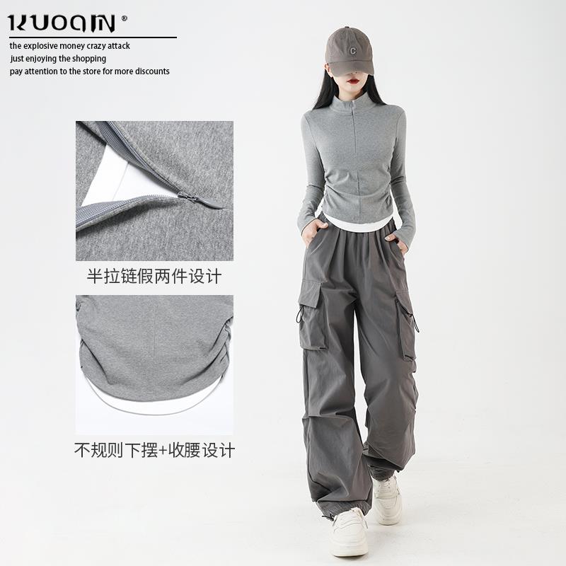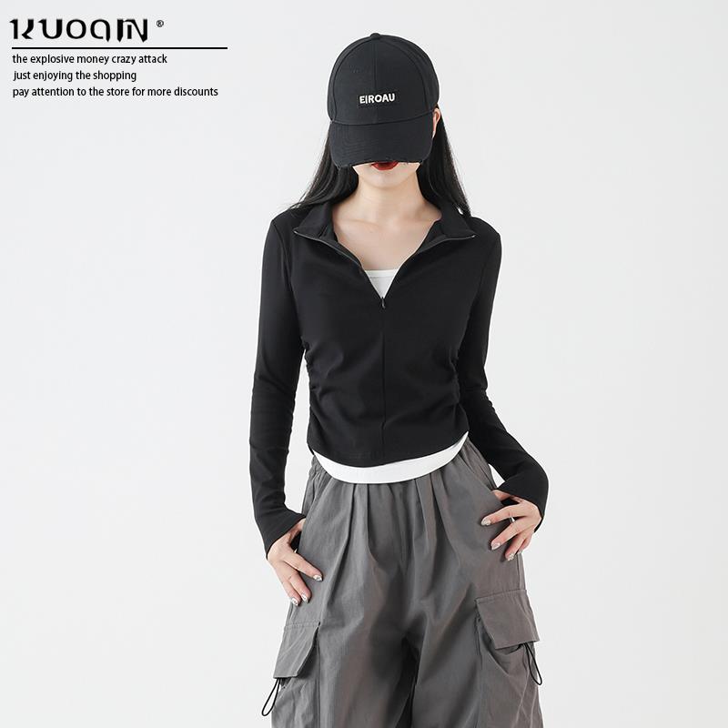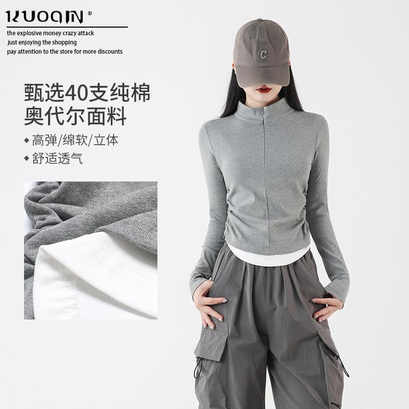 正肩假两件叠穿短款上衣女春纯棉立领长袖t恤酷飒风爵士舞穿搭