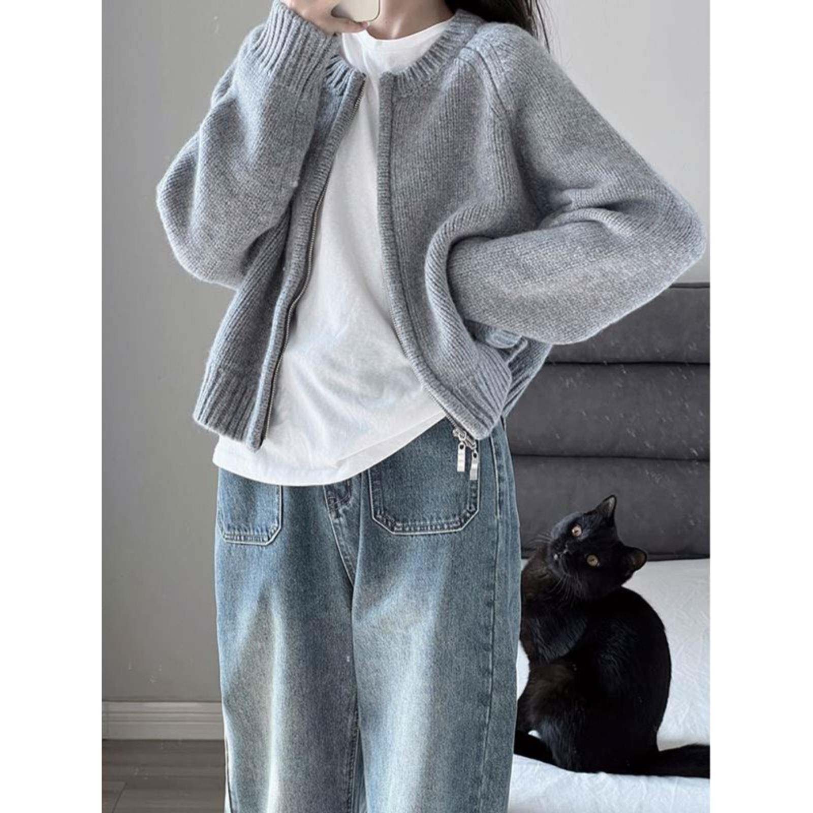 蓝色毛衣外套女针织开衫学生国潮牌秋冬外穿拉链上衣通勤卫衣加厚