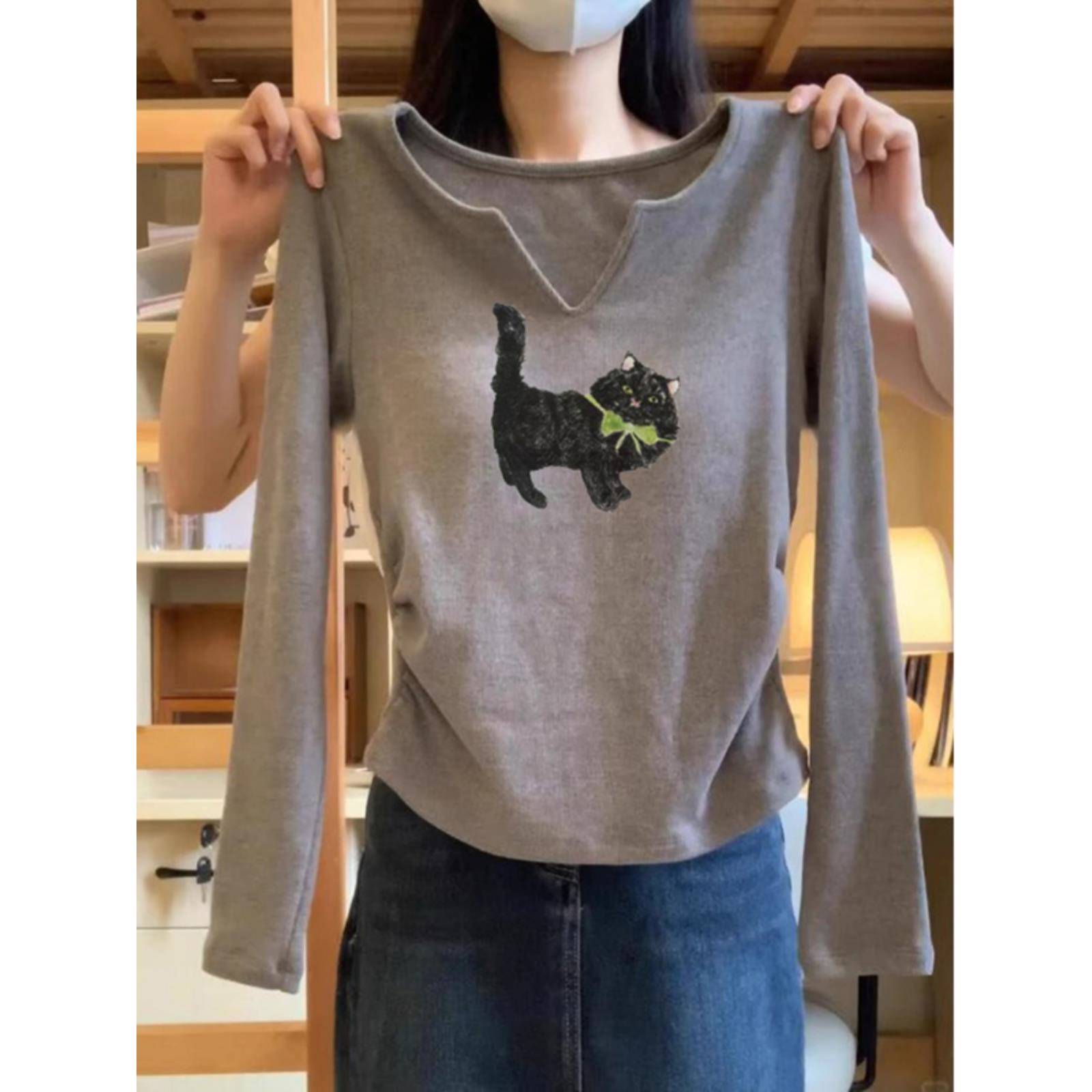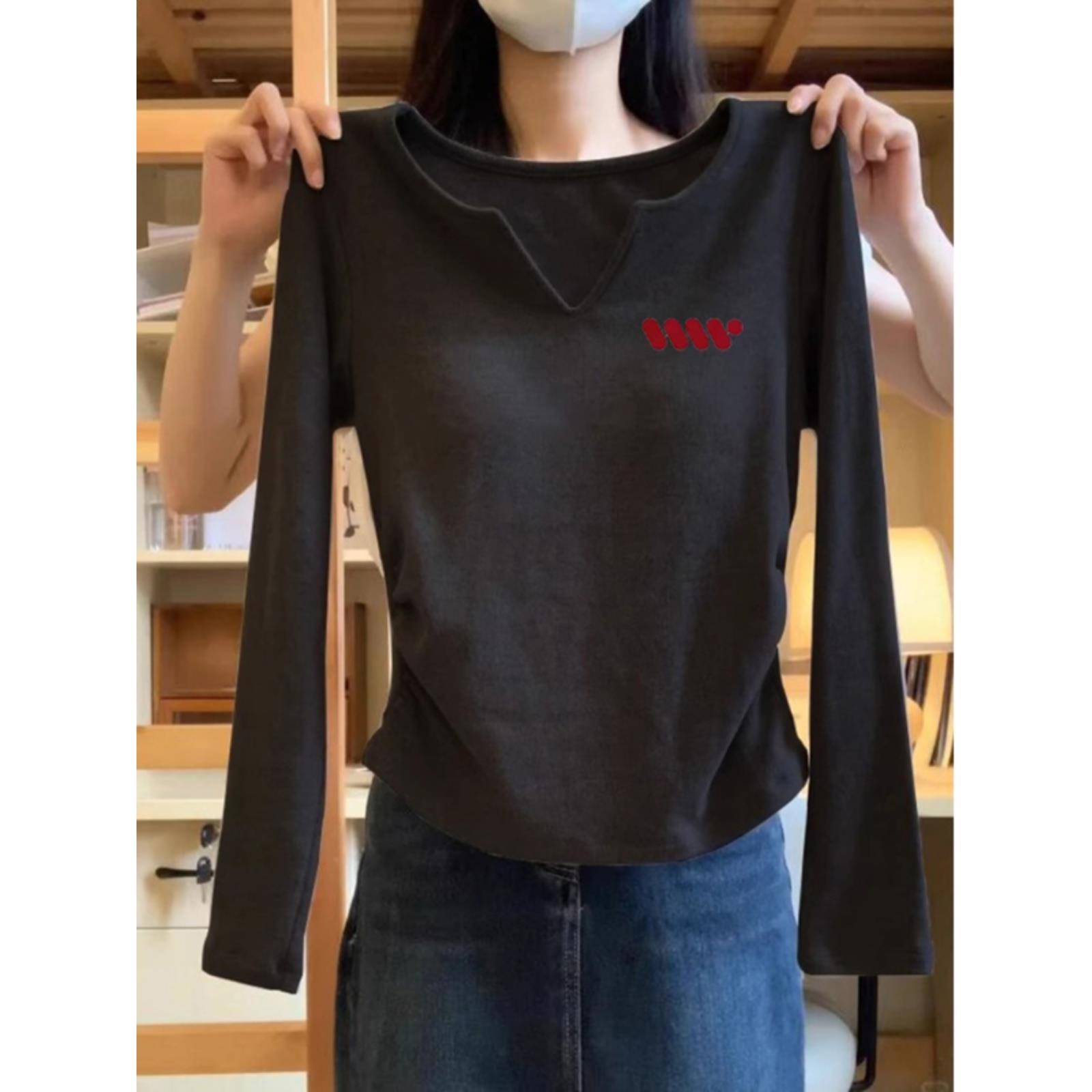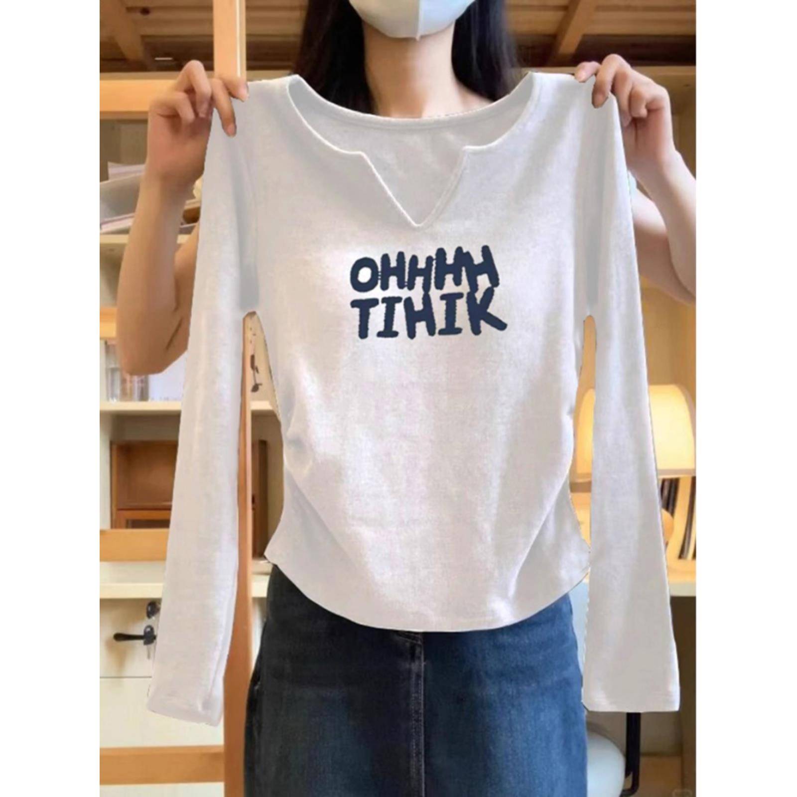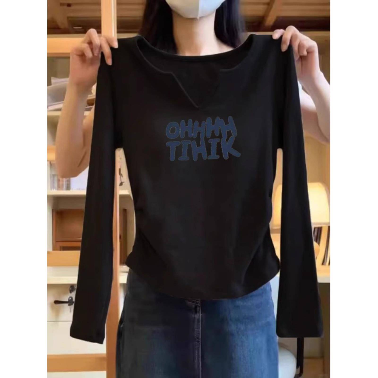 早春2025新款美式复古时尚设计感v领白色长袖t恤女内搭打底衫上衣