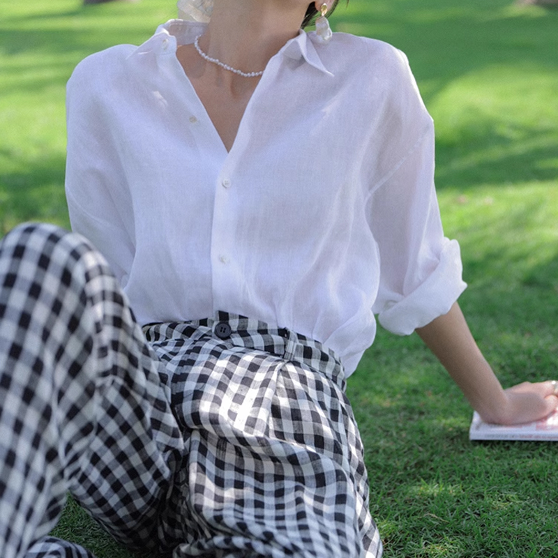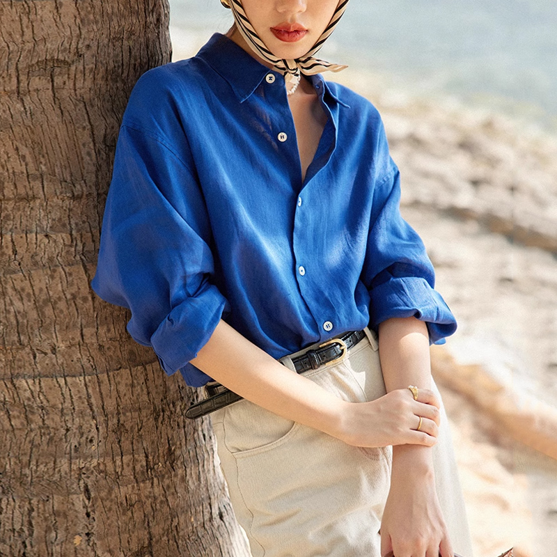 高级感亚麻衬衫女春秋高端独特超好看衬衫轻奢克莱因蓝色棉麻上衣