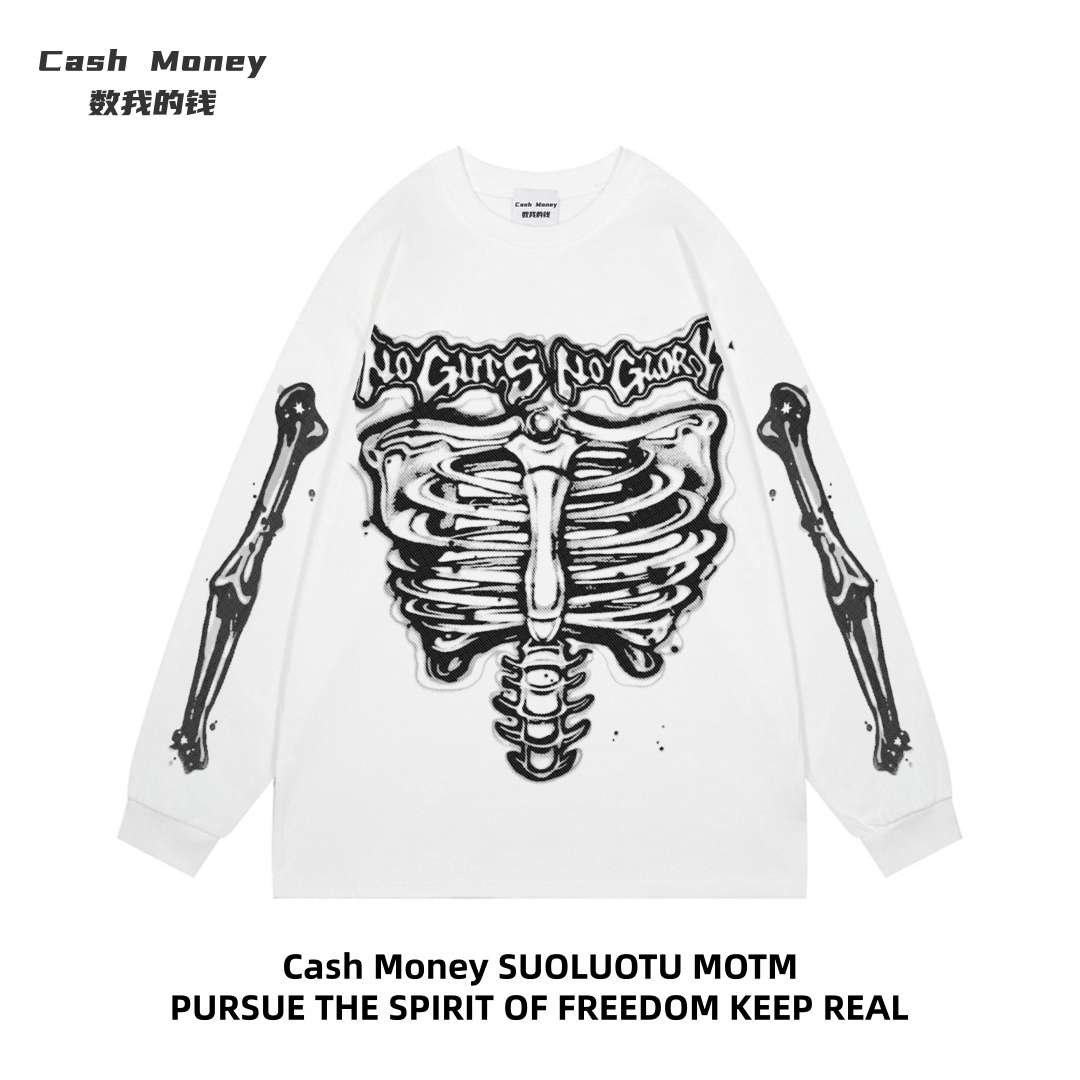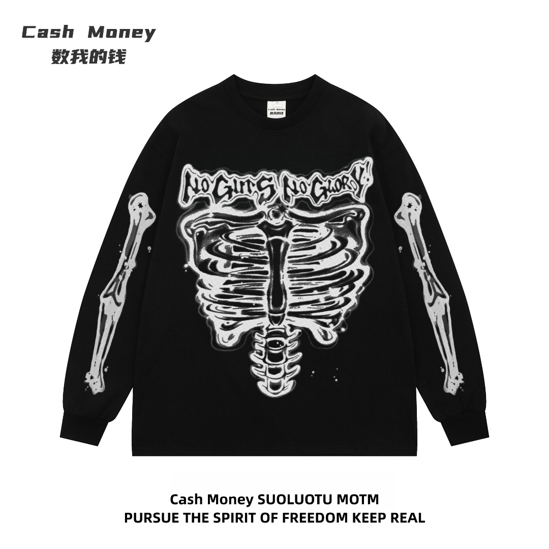 Cash Money数我的钱 美式高街骷髅印花T恤秋冬季套头长袖宽松潮牌