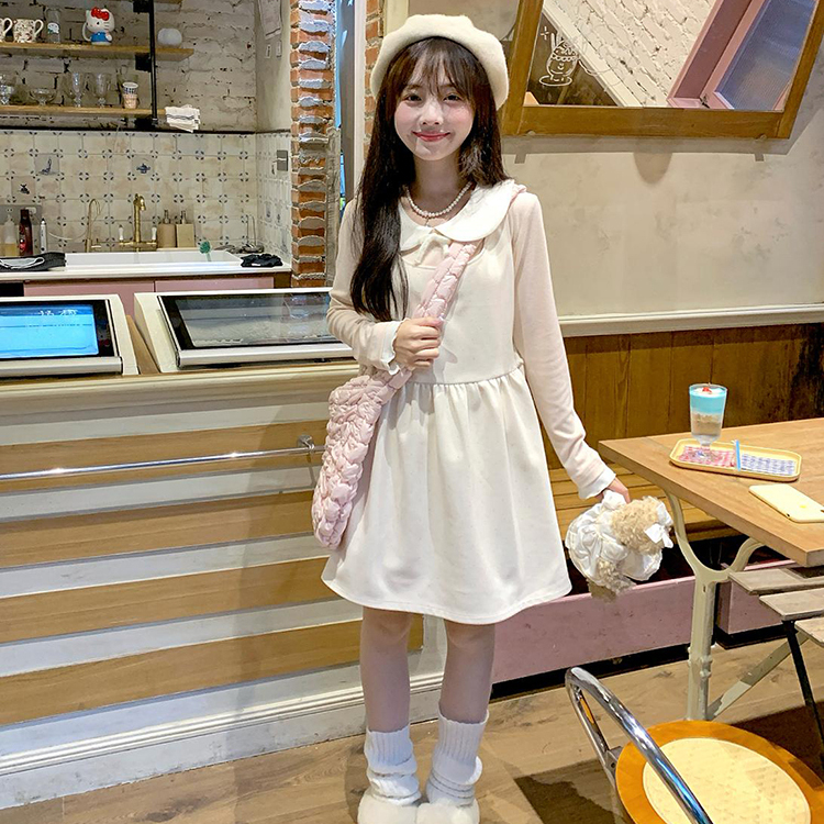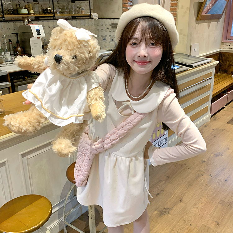 日系小个子甜美粉色娃娃领上衣+蝴蝶结波点背带连衣裙两件套秋季