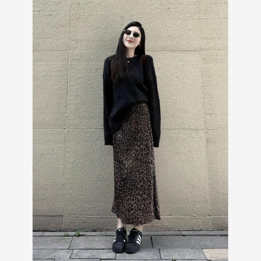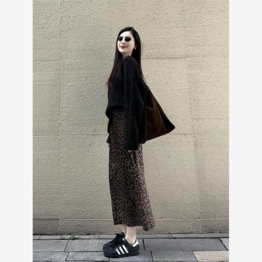 早秋超火一整套气质轻熟穿搭韩系慵懒风软糯黑色毛衣豹纹裙套装女