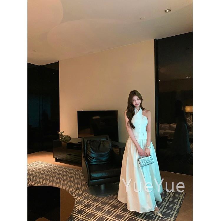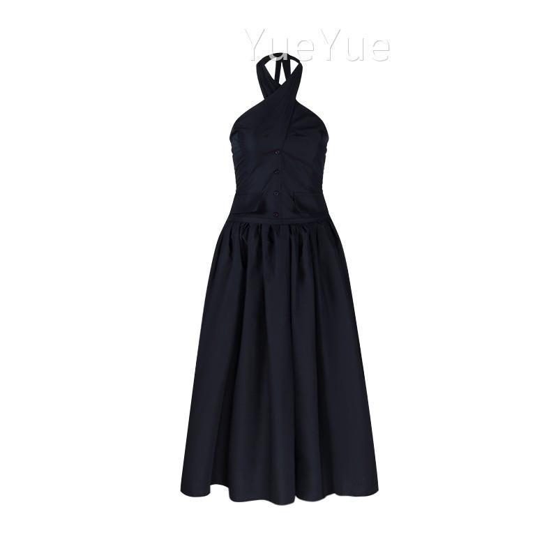 藏青计色露交叉挂脖衣裙女夏季纯欲收腰5347大摆长背裙设感a连字