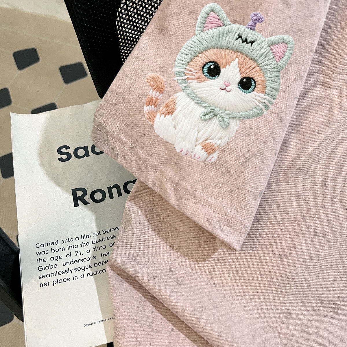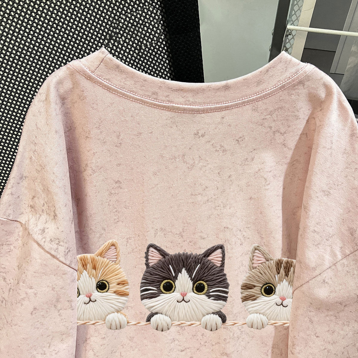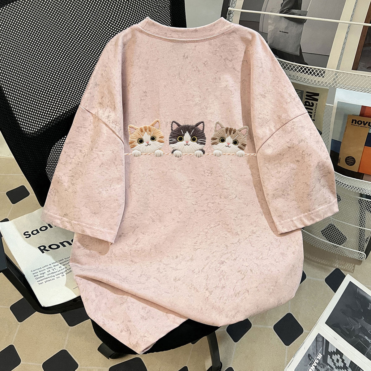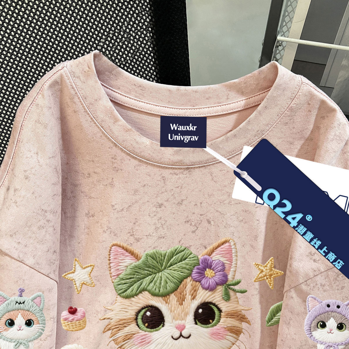 樱桃小猫仿刺绣100%纯棉女童夏季扎染短袖中学生百搭时髦上衣ins
