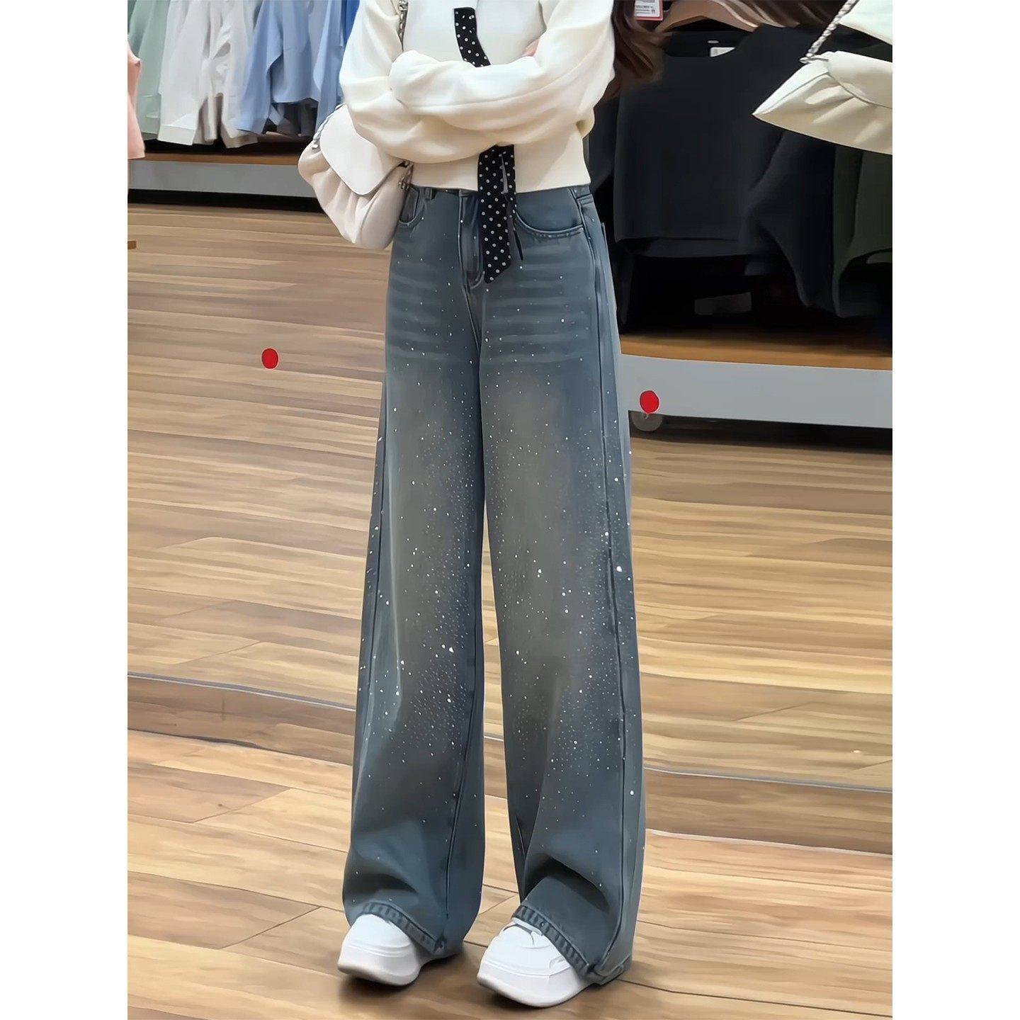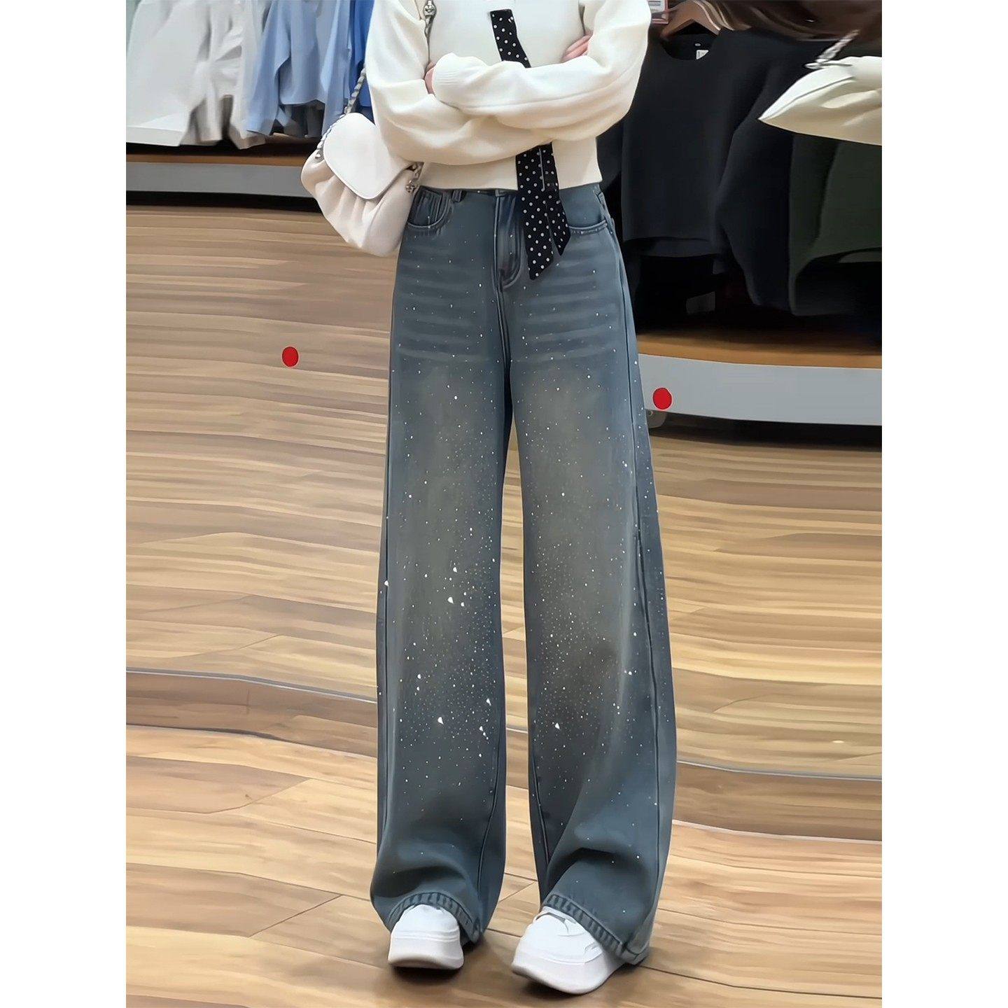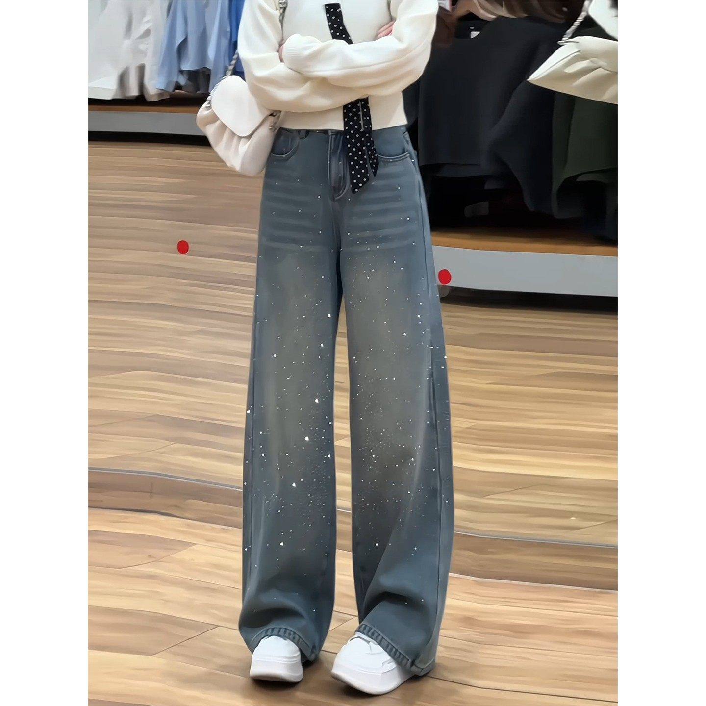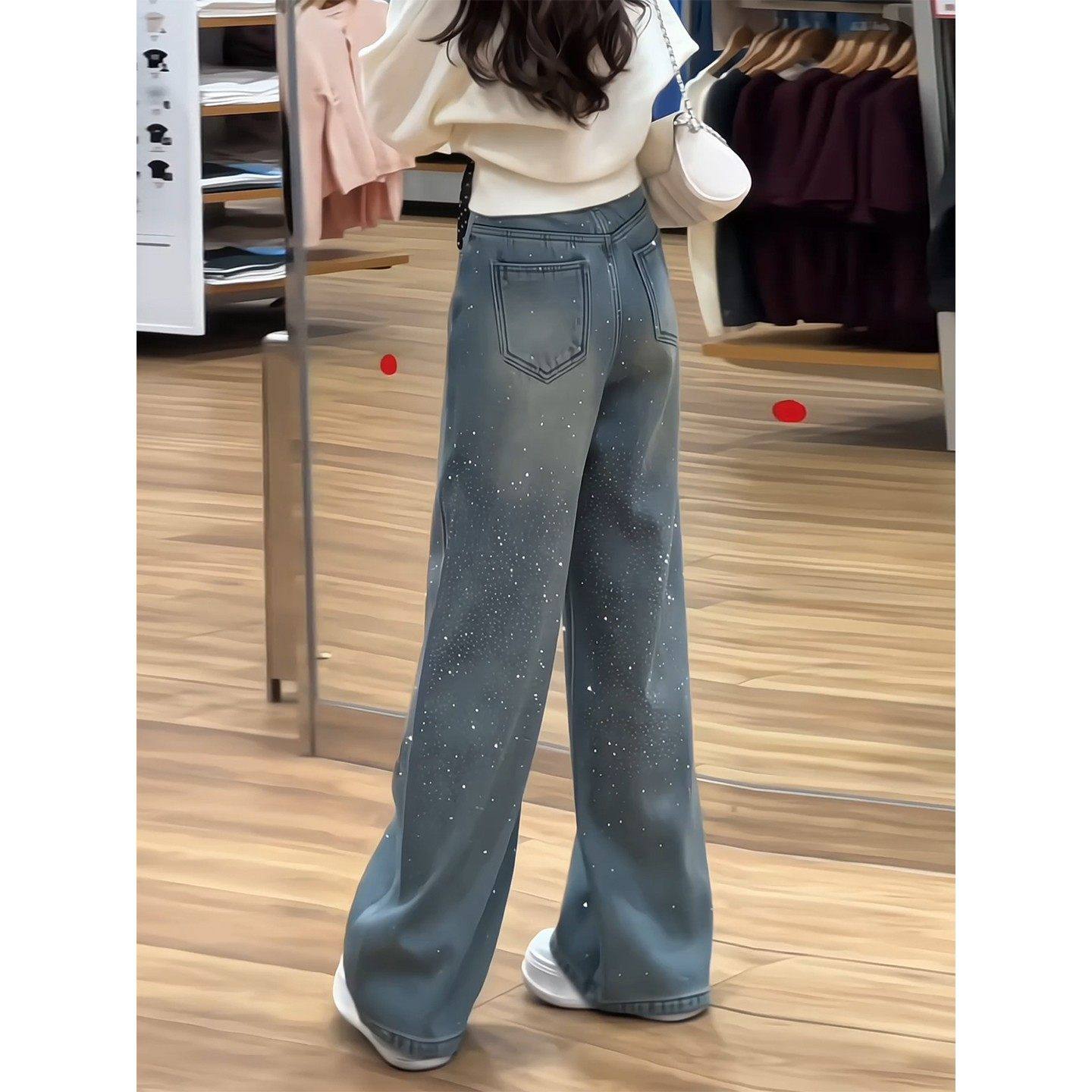 蓝色高级感烫钻阔腿牛仔裤女2026冬季新款宽松显瘦加绒直筒拖地裤