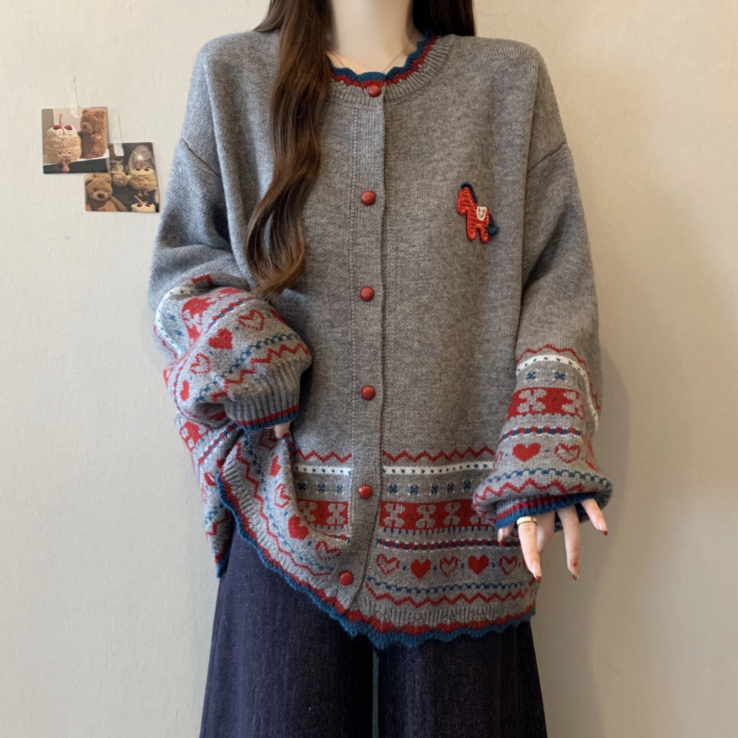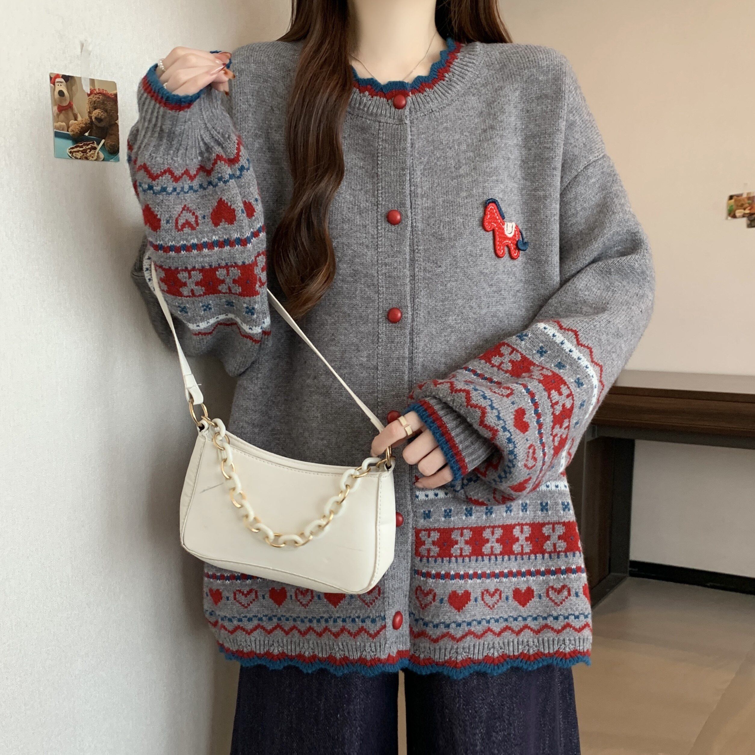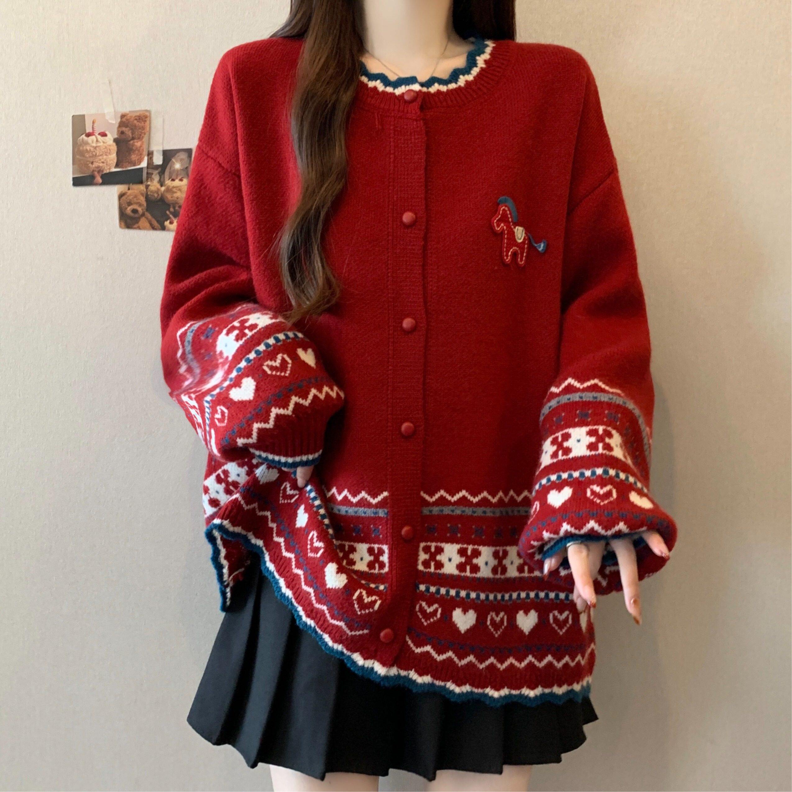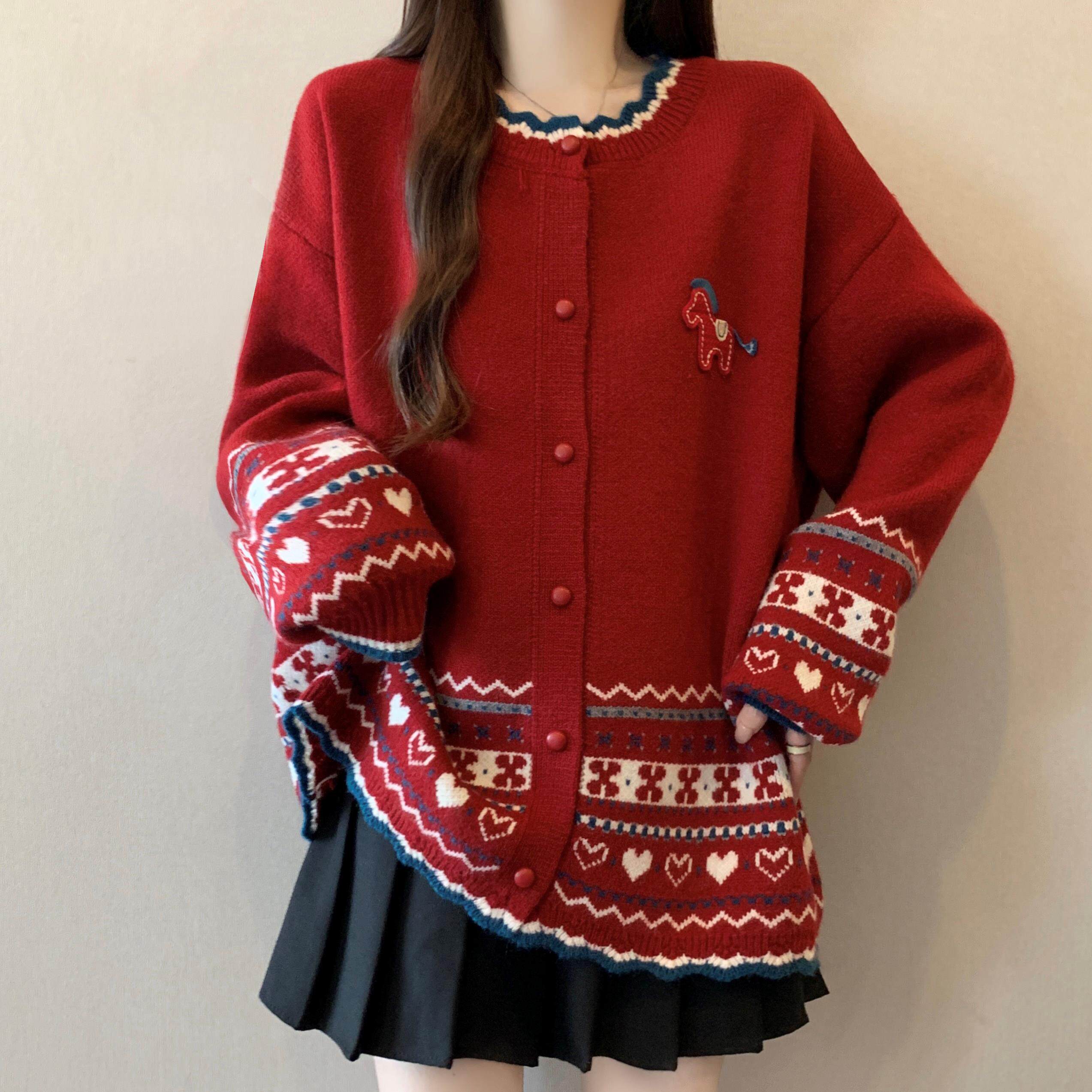 本命年马年红色费尔岛毛衣外套女2026新款冬大码胖mm针织开衫上衣