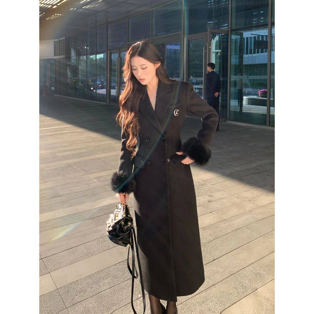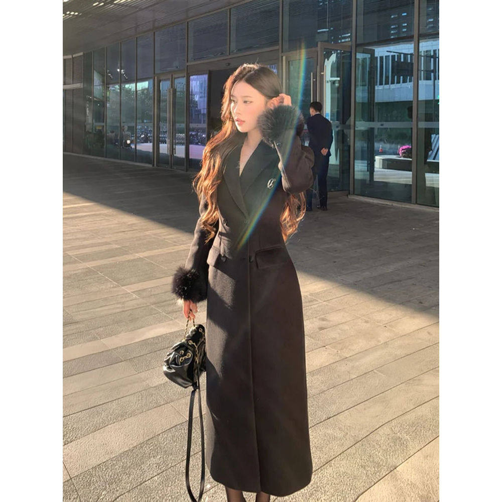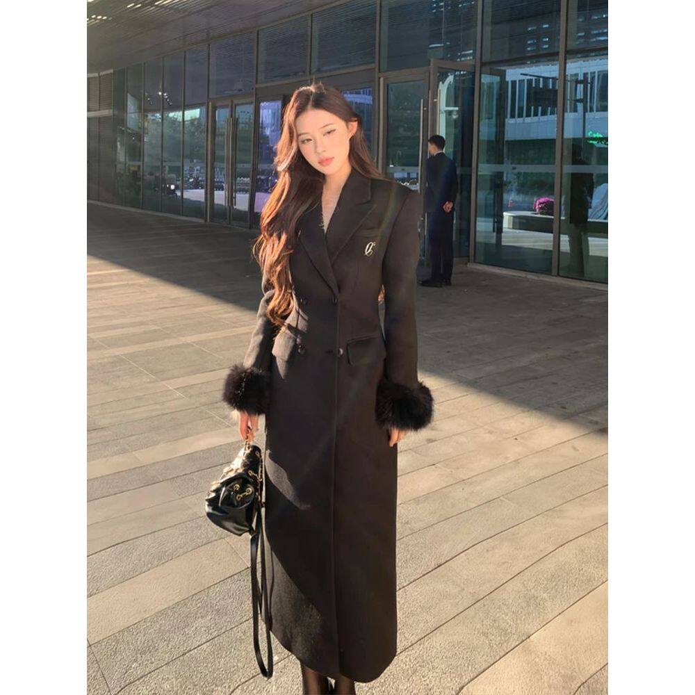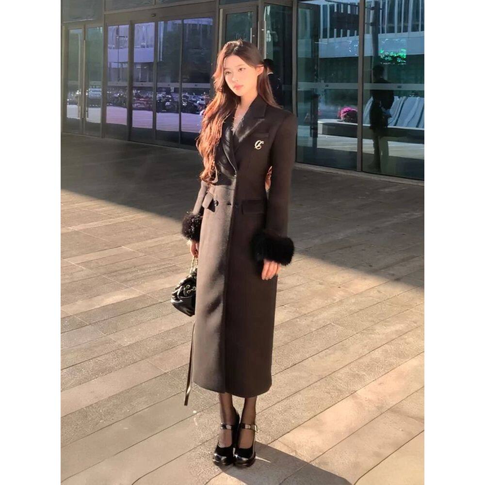 暗夜流光 法式赫本风黑色沙漏收腰长款冬季长款气质高级呢子大衣