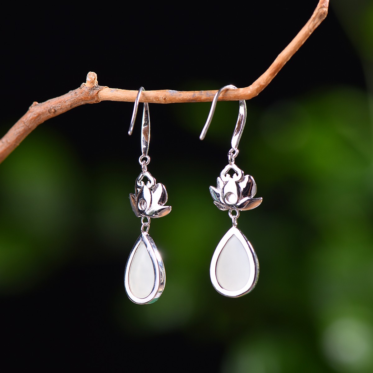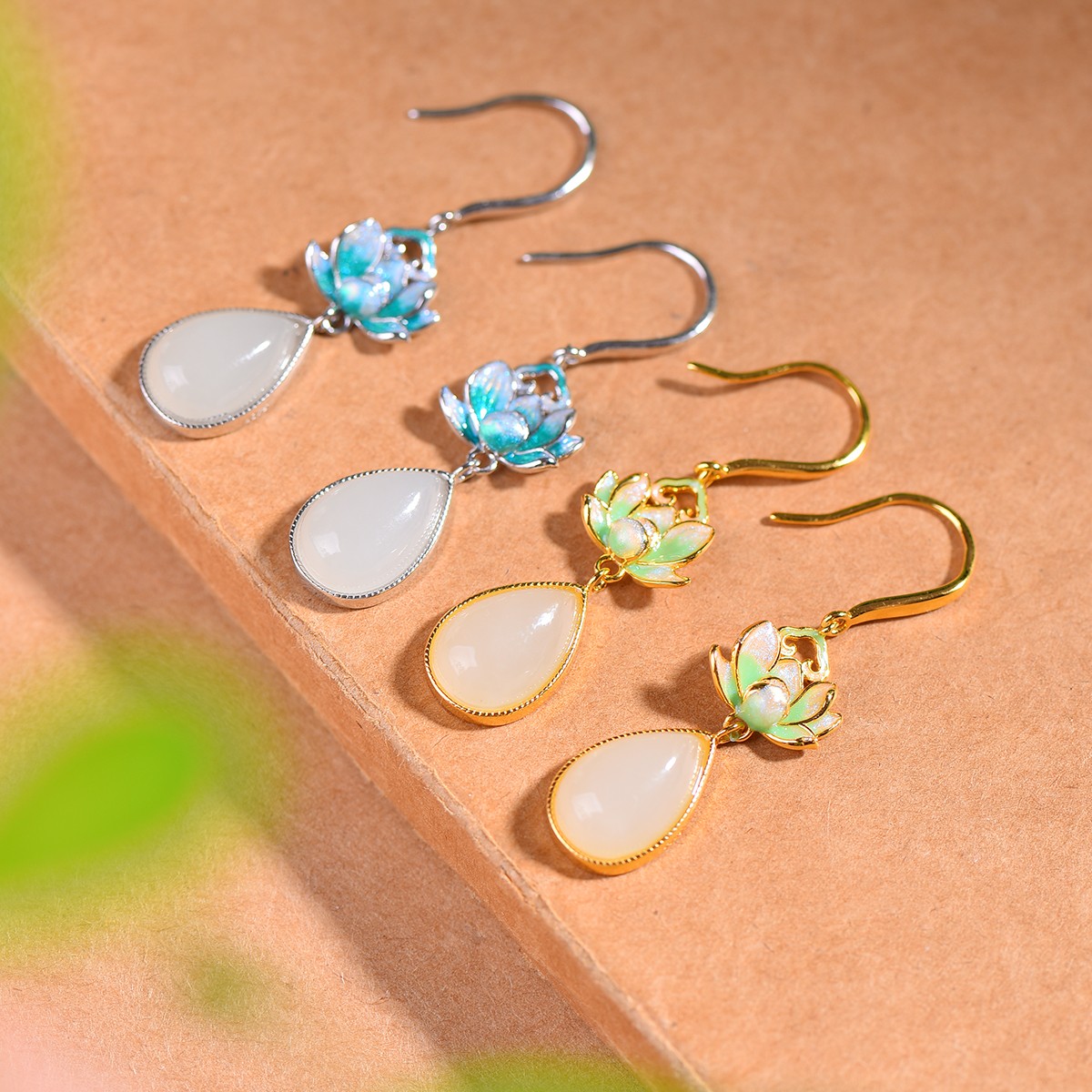天然和田玉925银镶嵌白玉珐琅彩莲花水滴荷欢玉露玉石耳环耳坠
