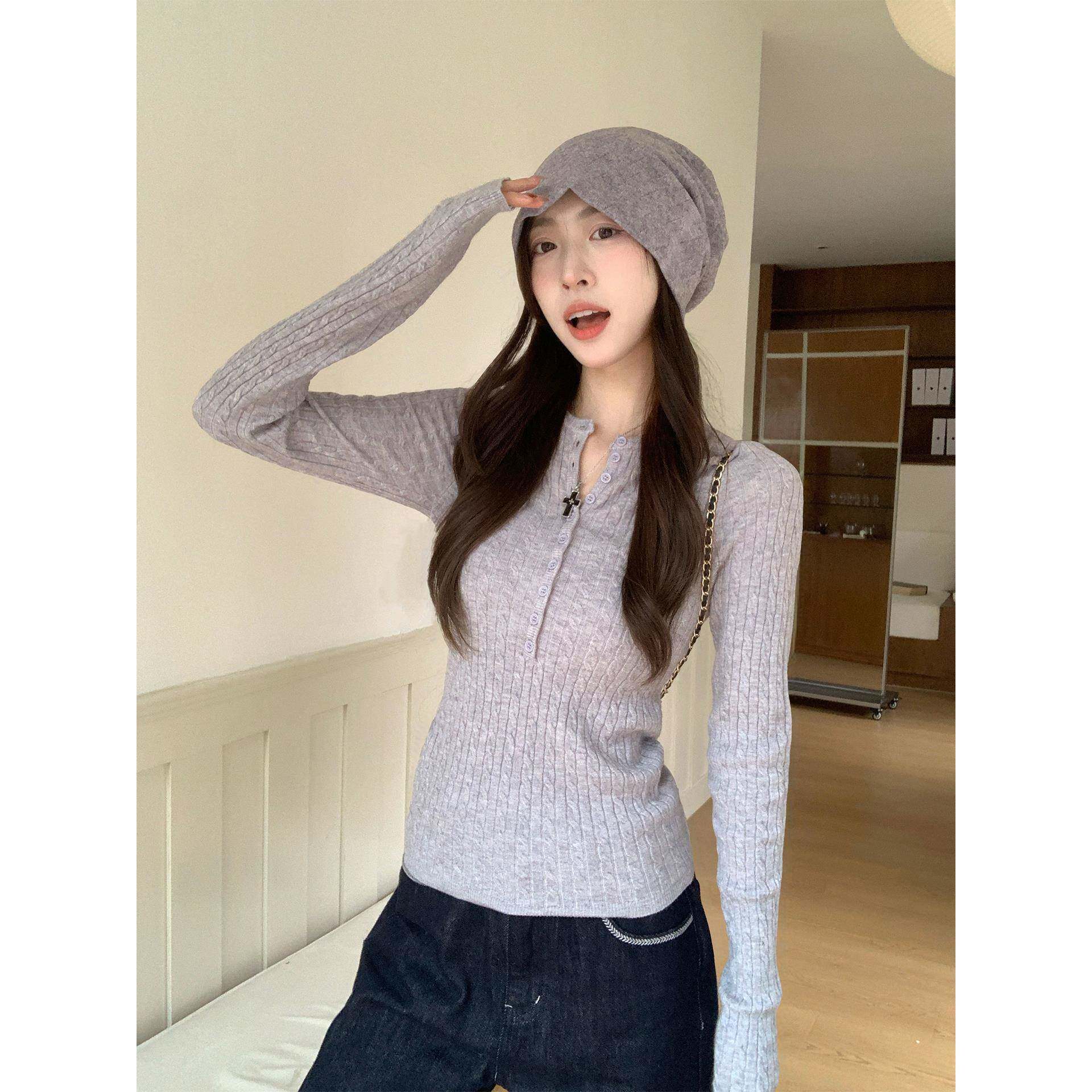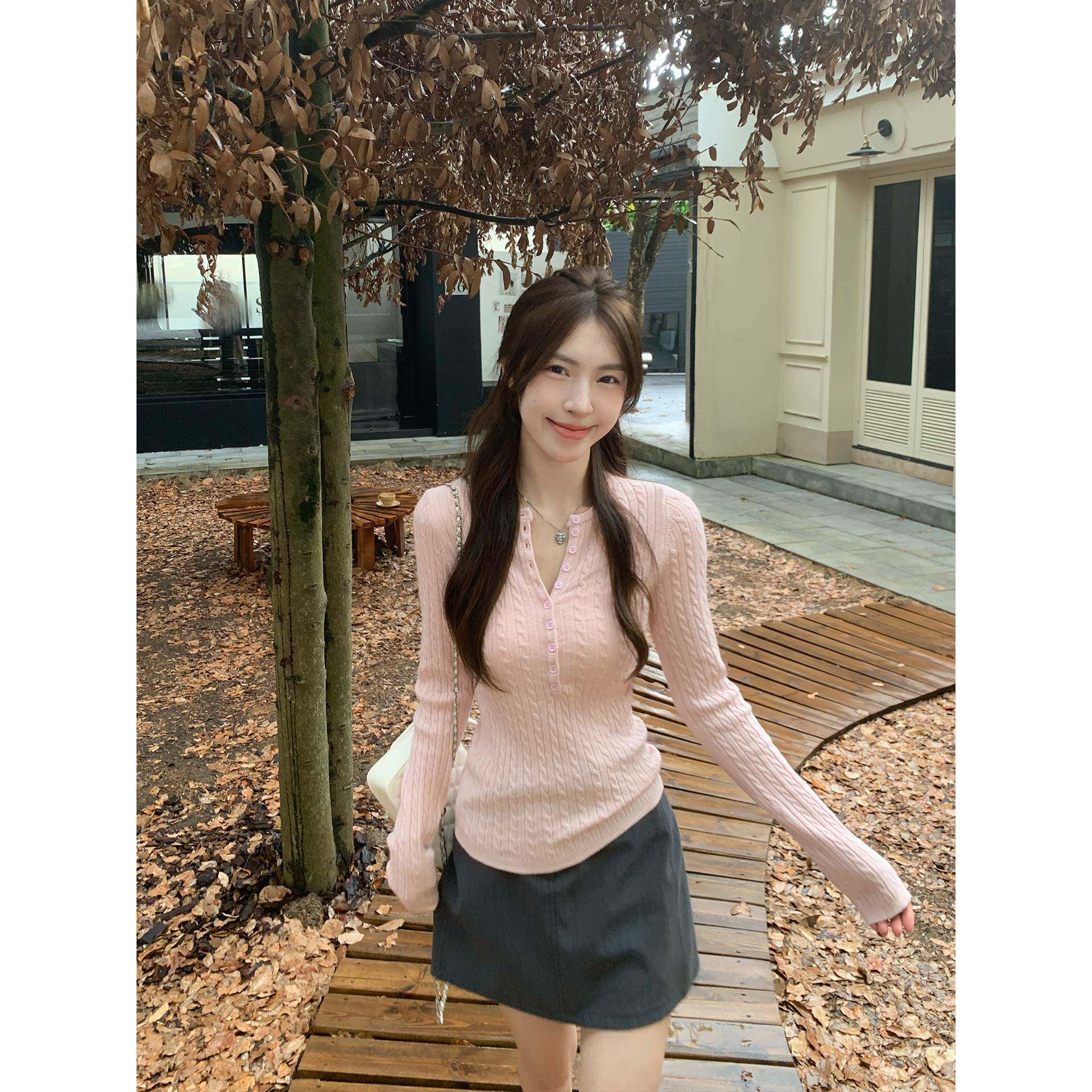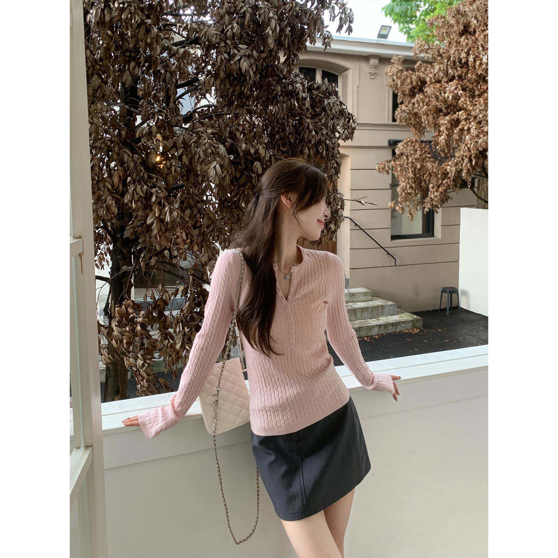 morning bloom纽扣半开领麻花长袖针织衫女秋季修身打底内搭上衣