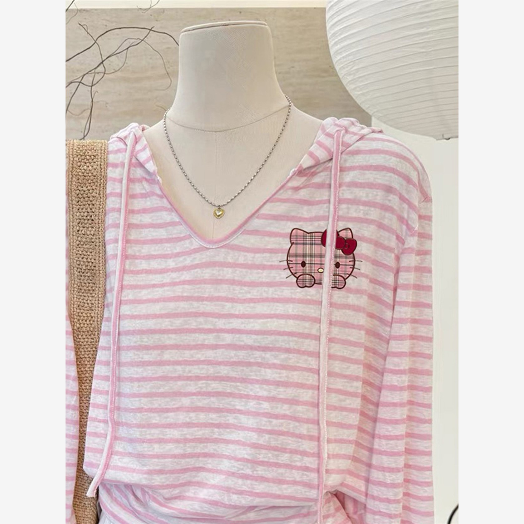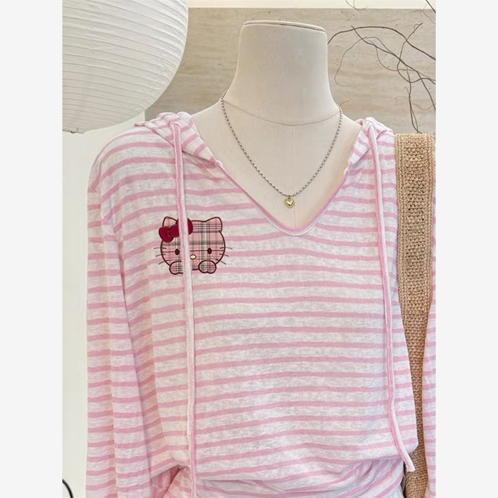 粉色KT猫印花条纹连帽长袖T恤女2025韩系慵懒风设计感巨好看上衣