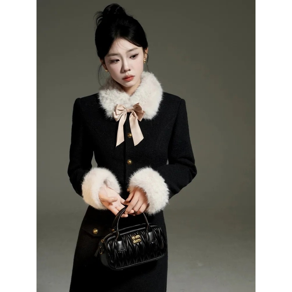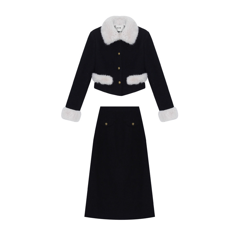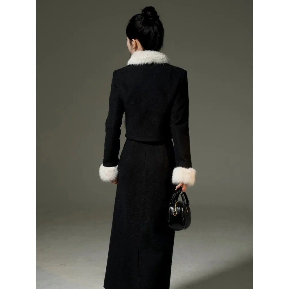 富家千金小香风时尚套装女秋冬加厚毛领外套+高腰半身长裙两件套
