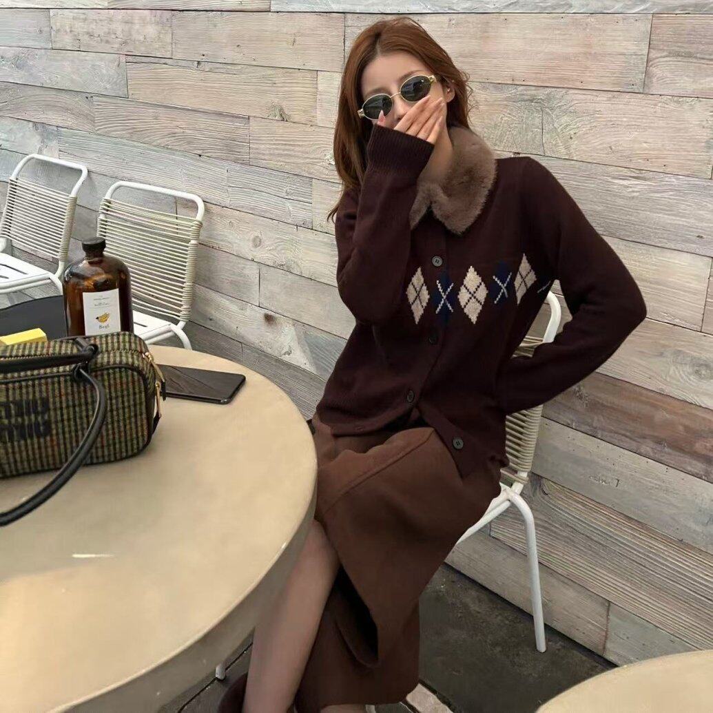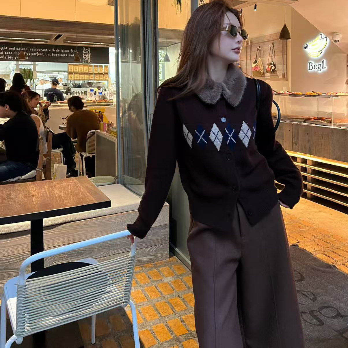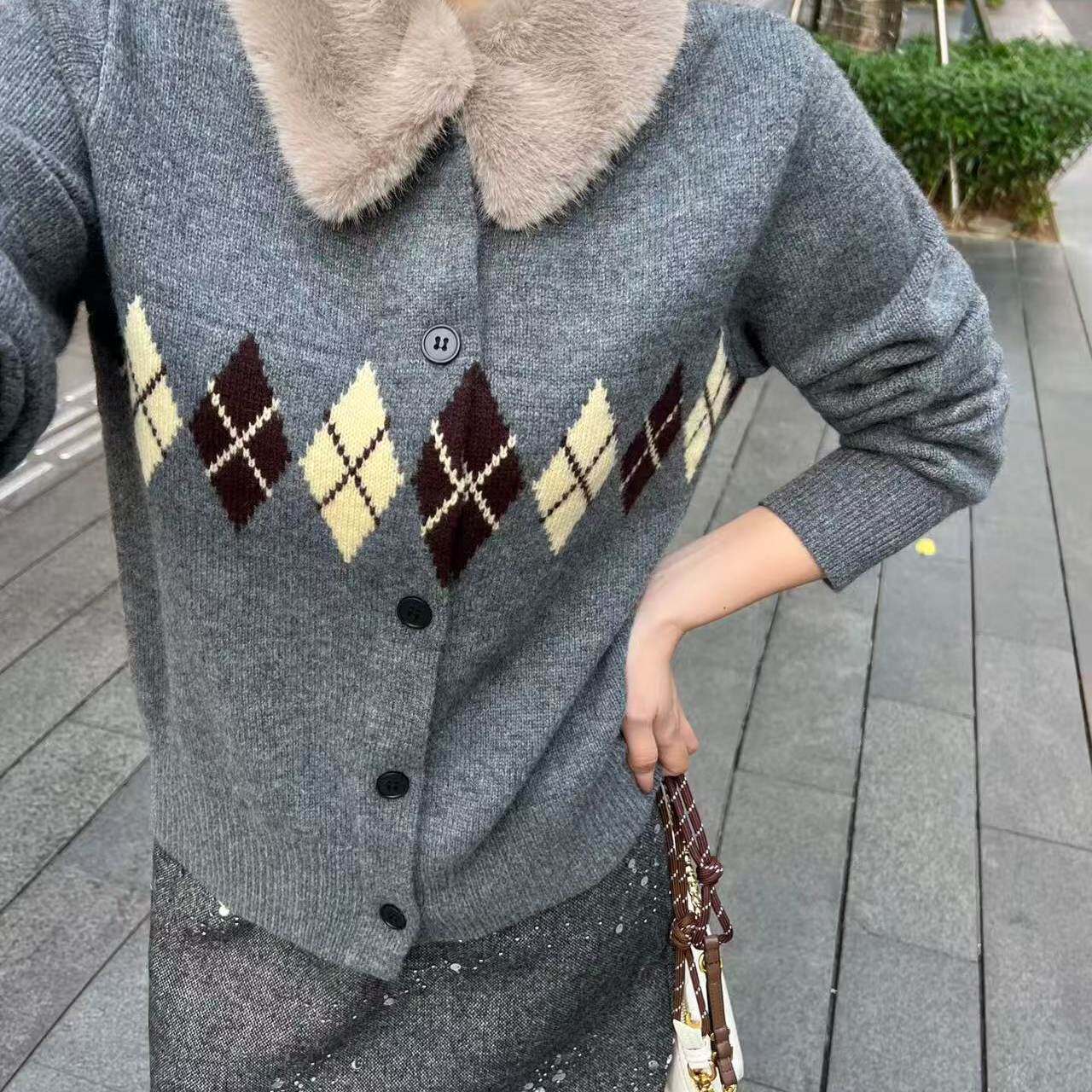 菱形块毛领针织开衫外套女2025年冬季新款短上衣名媛气质时尚热销