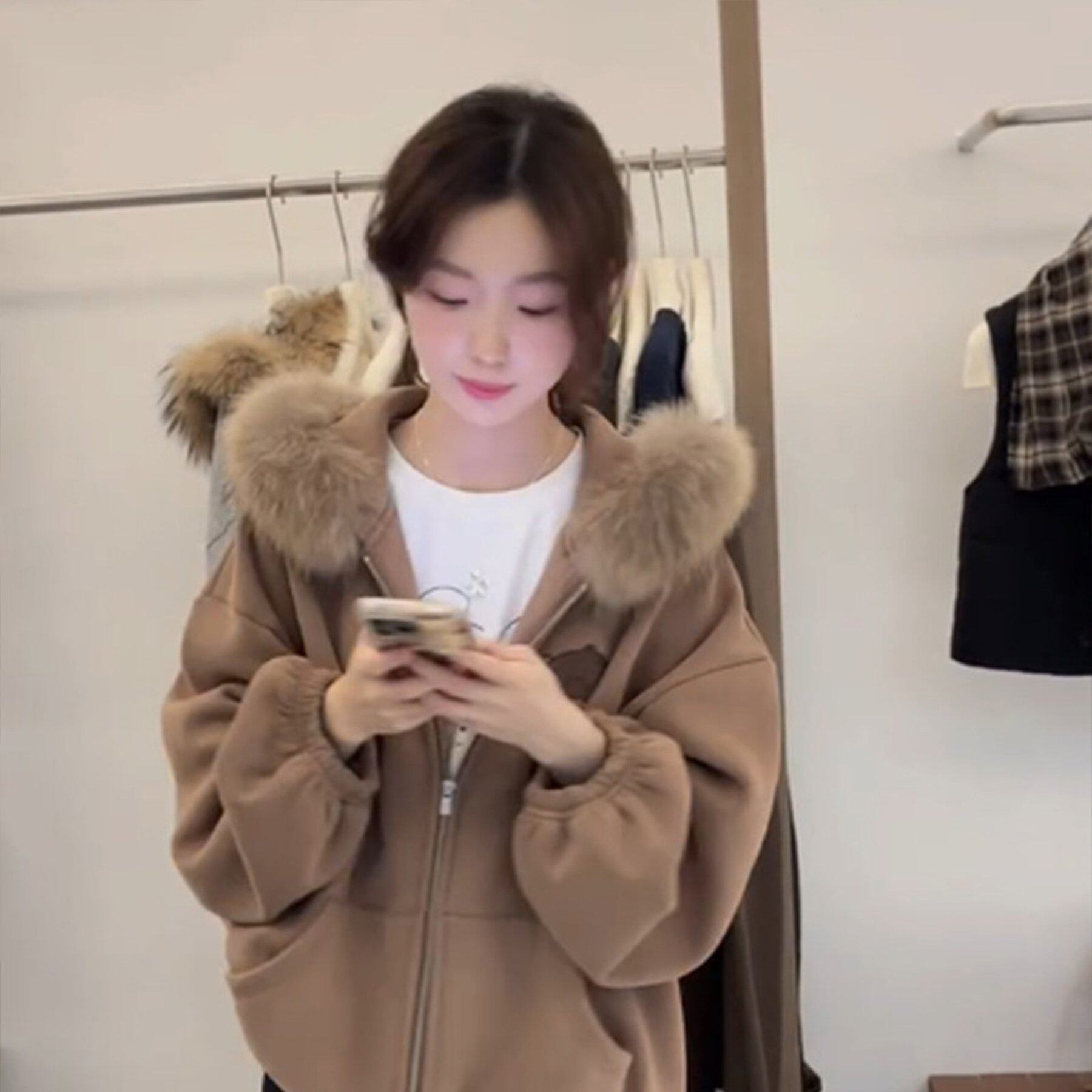 薄款/加绒广州工厂卡通猫咪印花连帽毛领外套女秋冬开衫卫衣