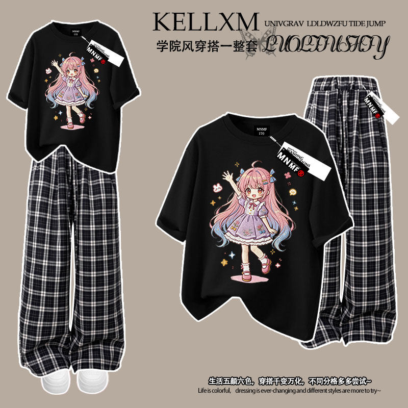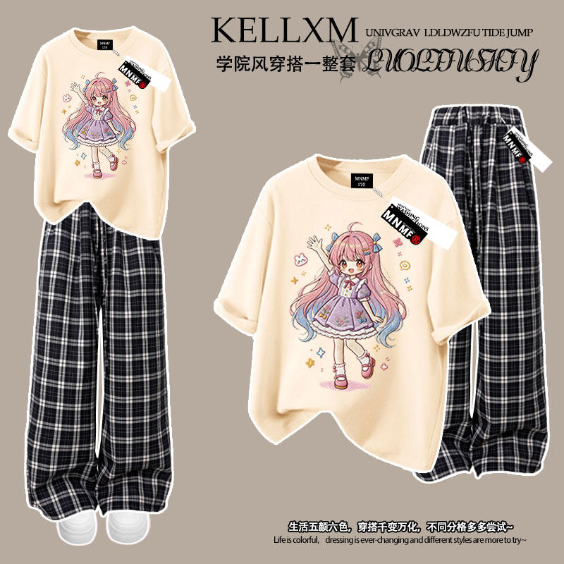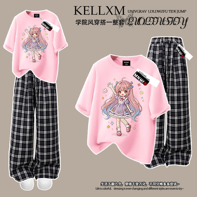 仿刺绣可爱女孩2026夏季女童纯棉短袖t恤格子裤套装中大童时尚ins