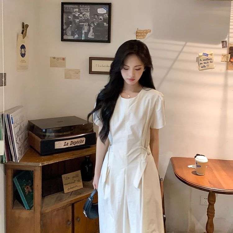 2025高级韩版夏季新款杏色圆领法式收腰显瘦气质短袖中长款连衣裙