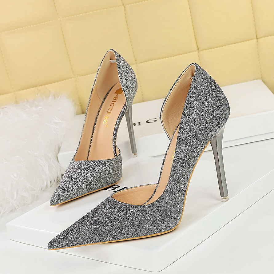 1298-1复古欧美风高跟鞋细跟浅口尖头侧镂空闪耀亮片布高跟女单鞋