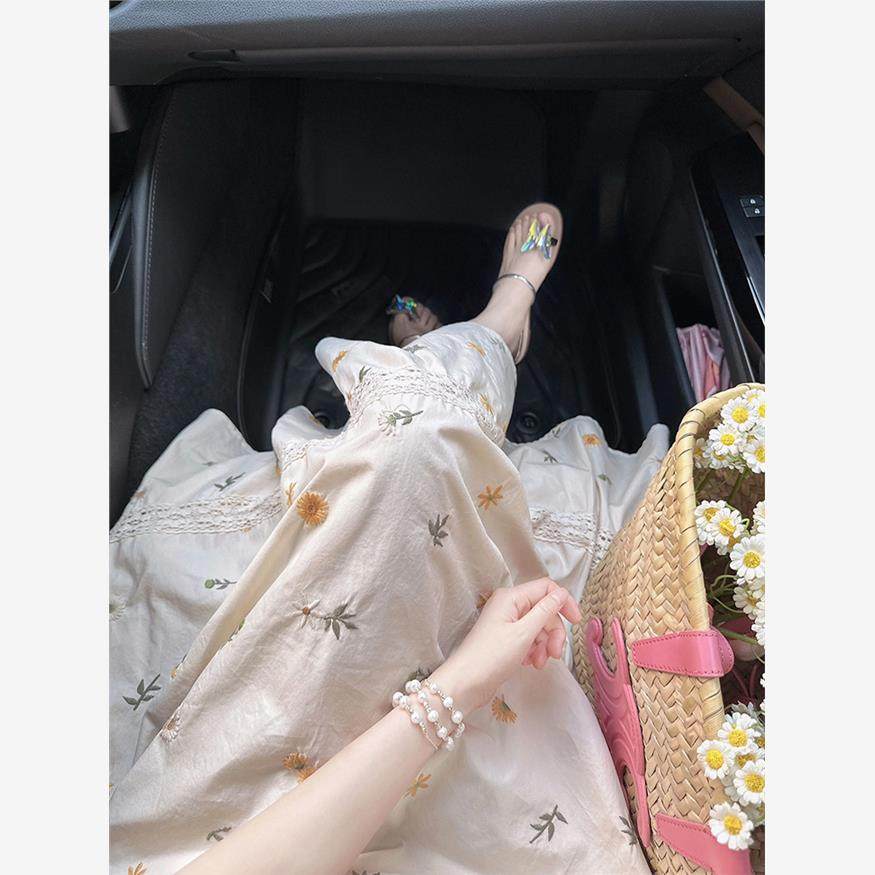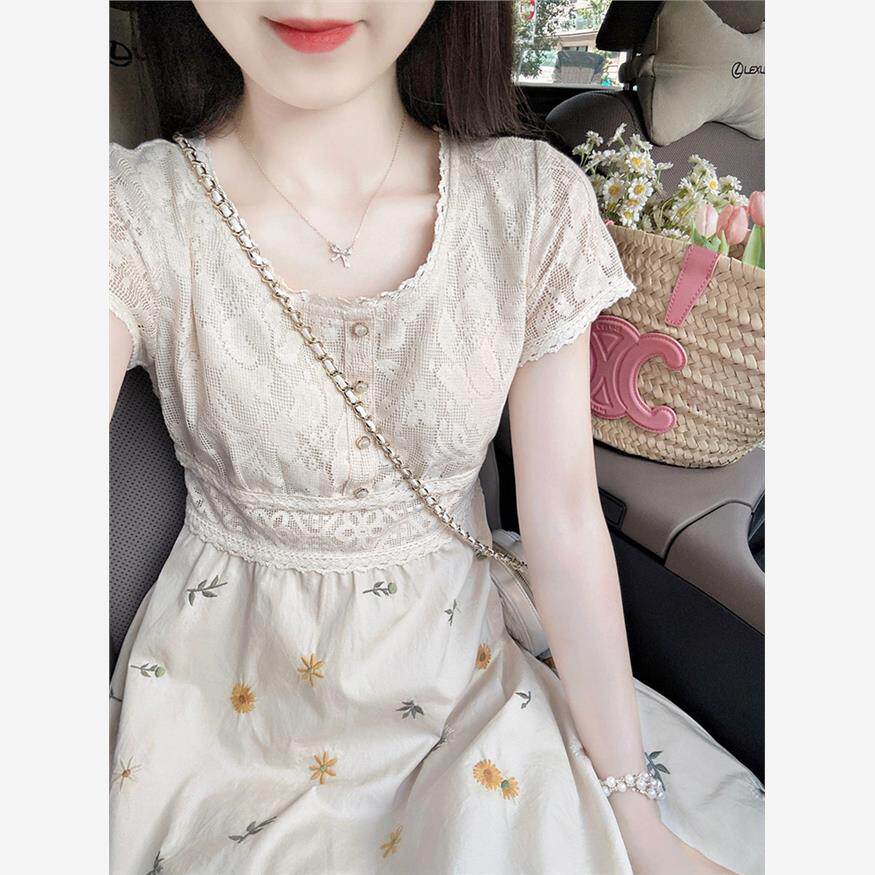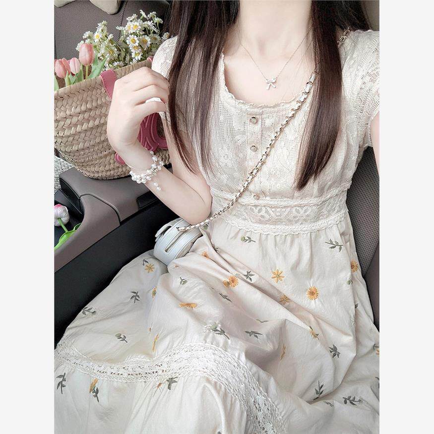 2025新款法式复古高级感茶歇长款长裙气质短袖碎花连衣裙子女夏季