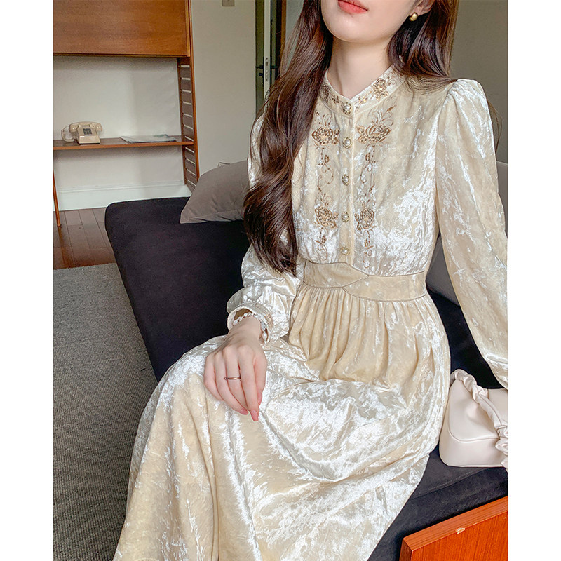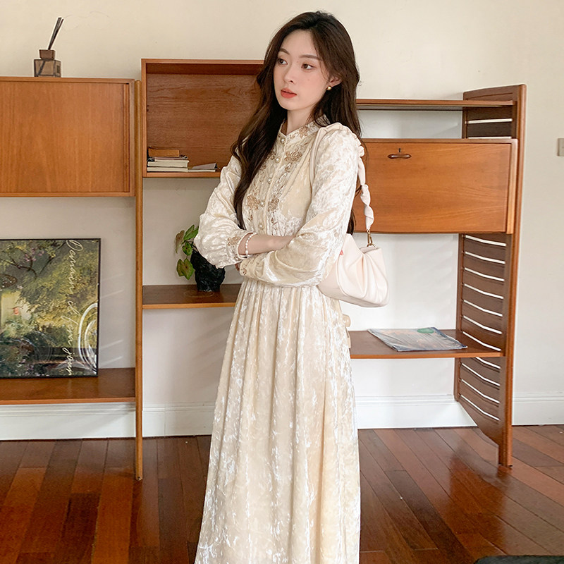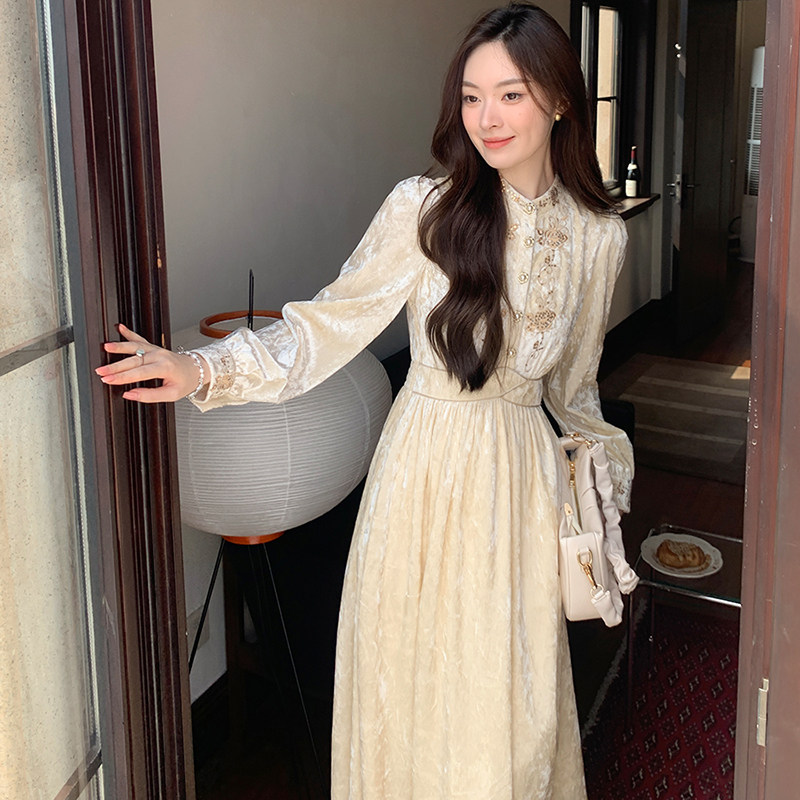 2025新款春季新中式圆领减龄米白色长袖连衣裙女D0079