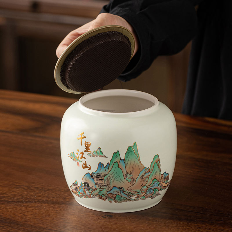 千里江山茶叶罐陶瓷大容量茶叶存储密封空罐子普洱红茶绿茶储茶罐