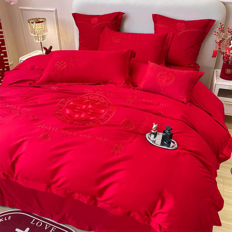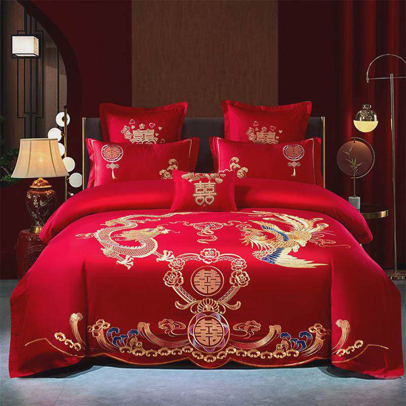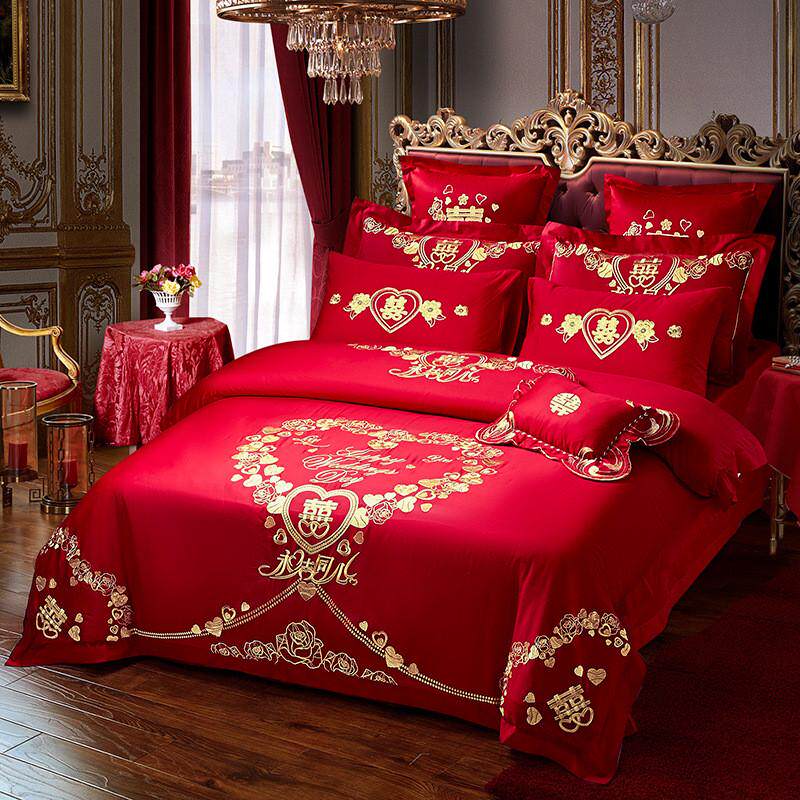结婚四件套大红色婚房喜被床单龙凤刺绣被套被单婚礼婚庆床上用品