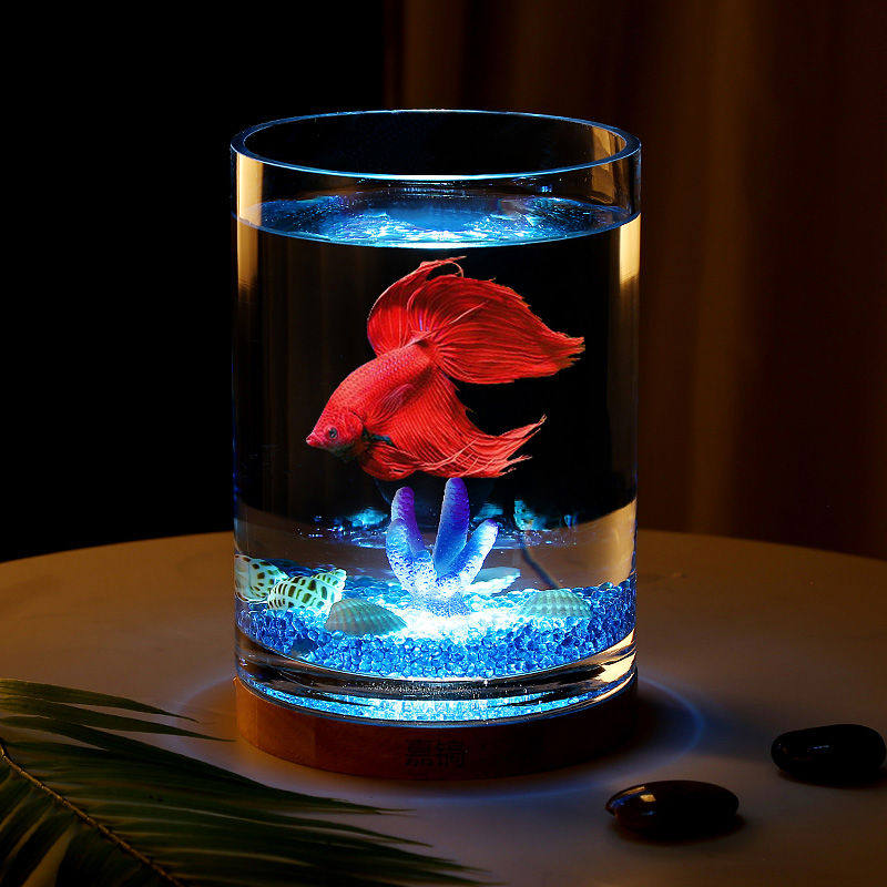 创意斗鱼缸圆形玻璃办公桌小型桌面孔雀鱼缸客厅夜灯加厚小金