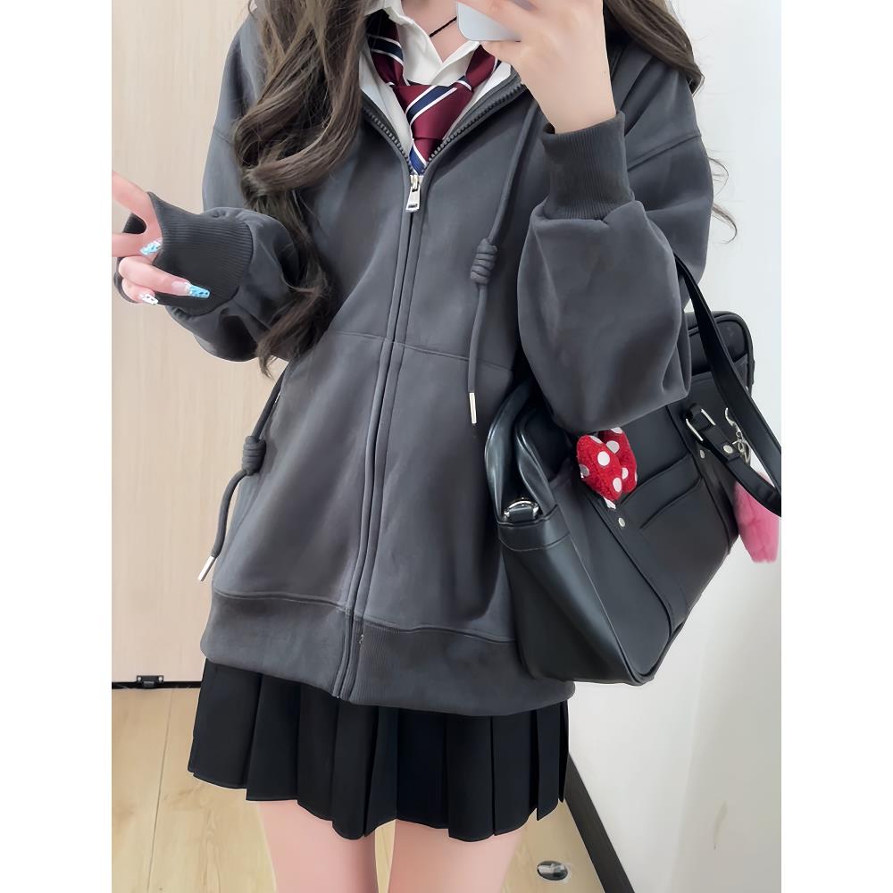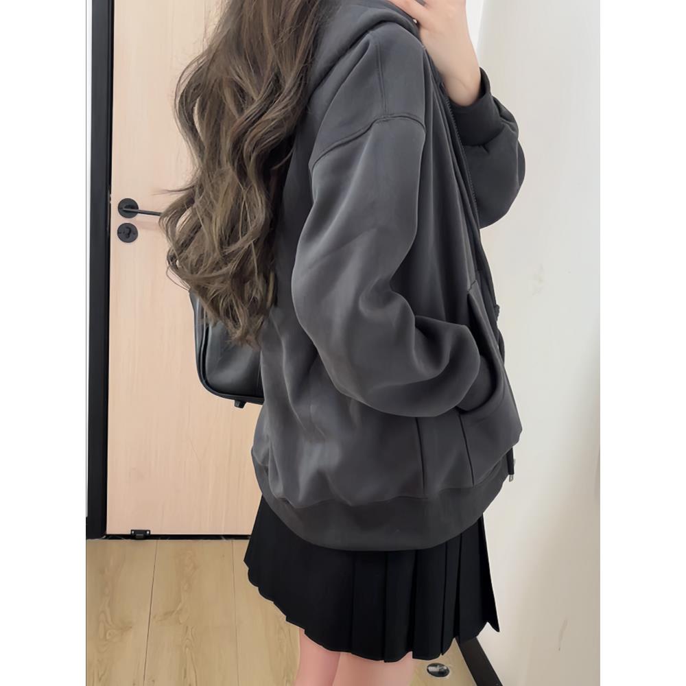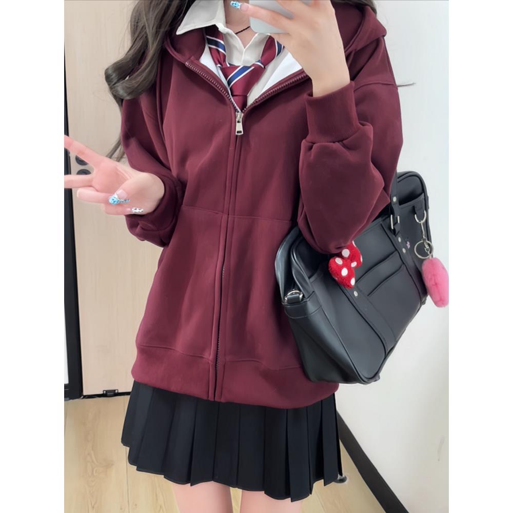 藏青宽松连帽卫衣女学生春秋百搭酒红加厚拉链开衫浅灰jk外套上衣