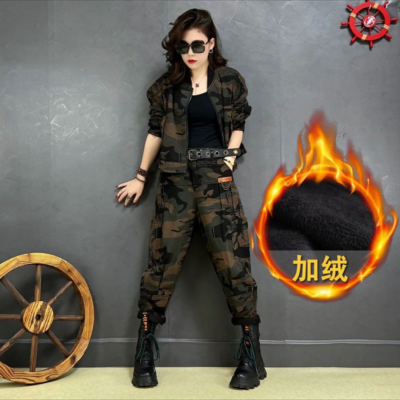 早秋款潮酷洋气迷彩外套做旧重工设计款哈伦牛仔裤加绒加厚两件套