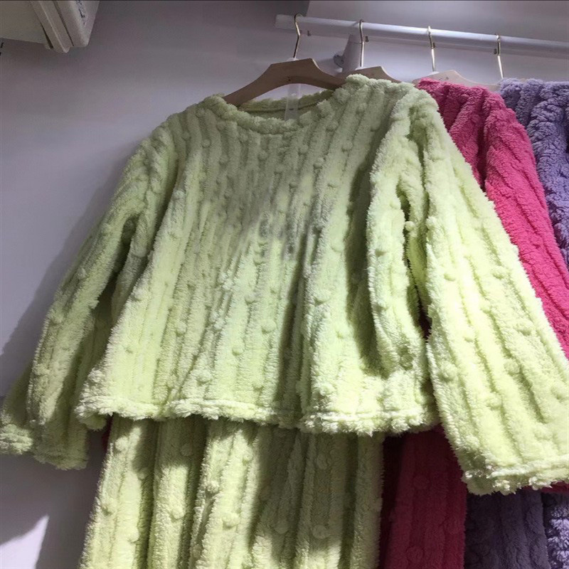 秋冬季法兰绒睡衣女可爱卡通圆领珊瑚绒条纹提花保暖家居服