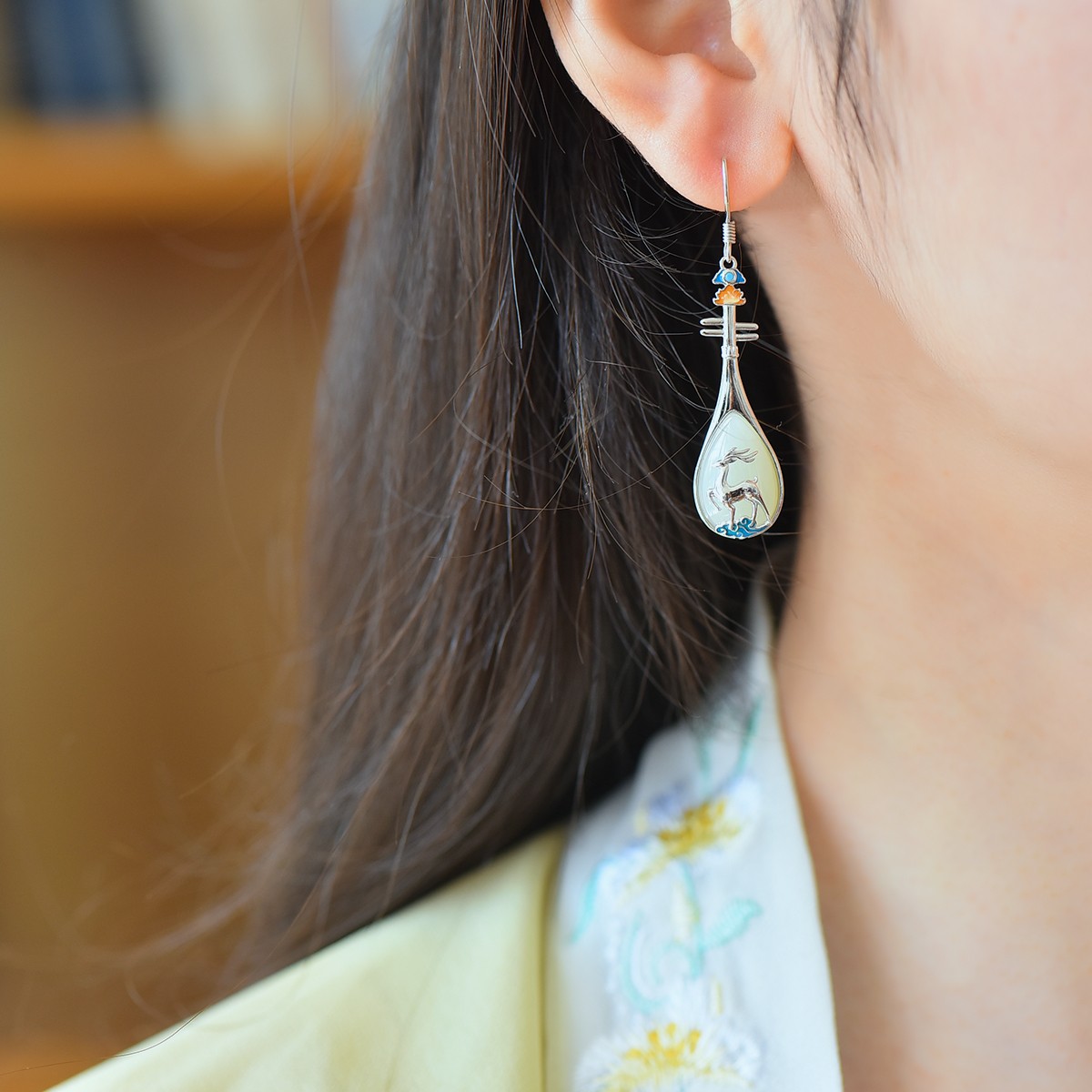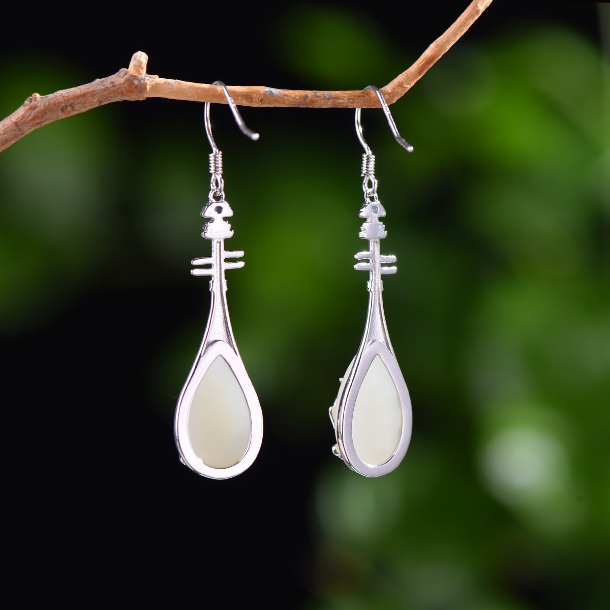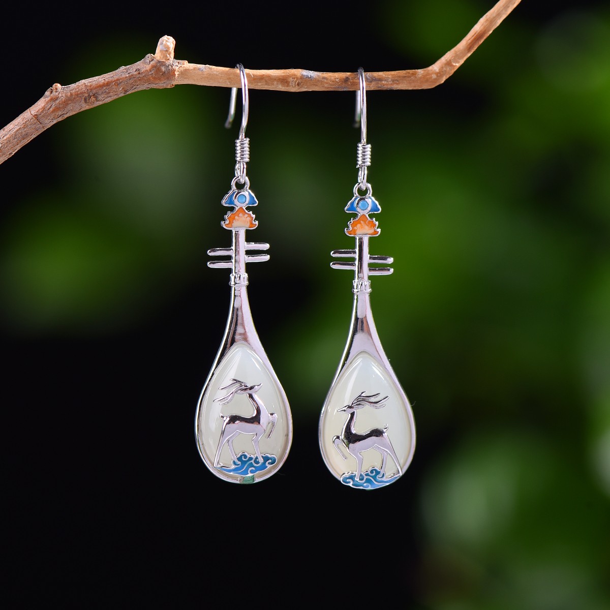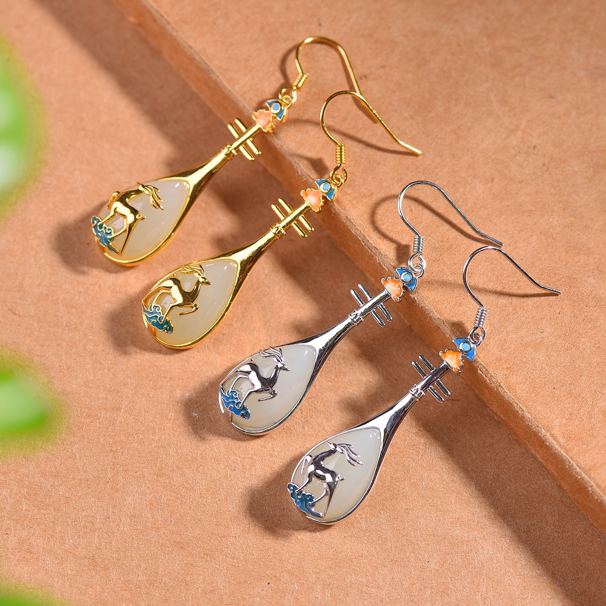 天然和田玉925银镶嵌白玉珐琅彩绘琵琶玉石耳坠耳环耳饰